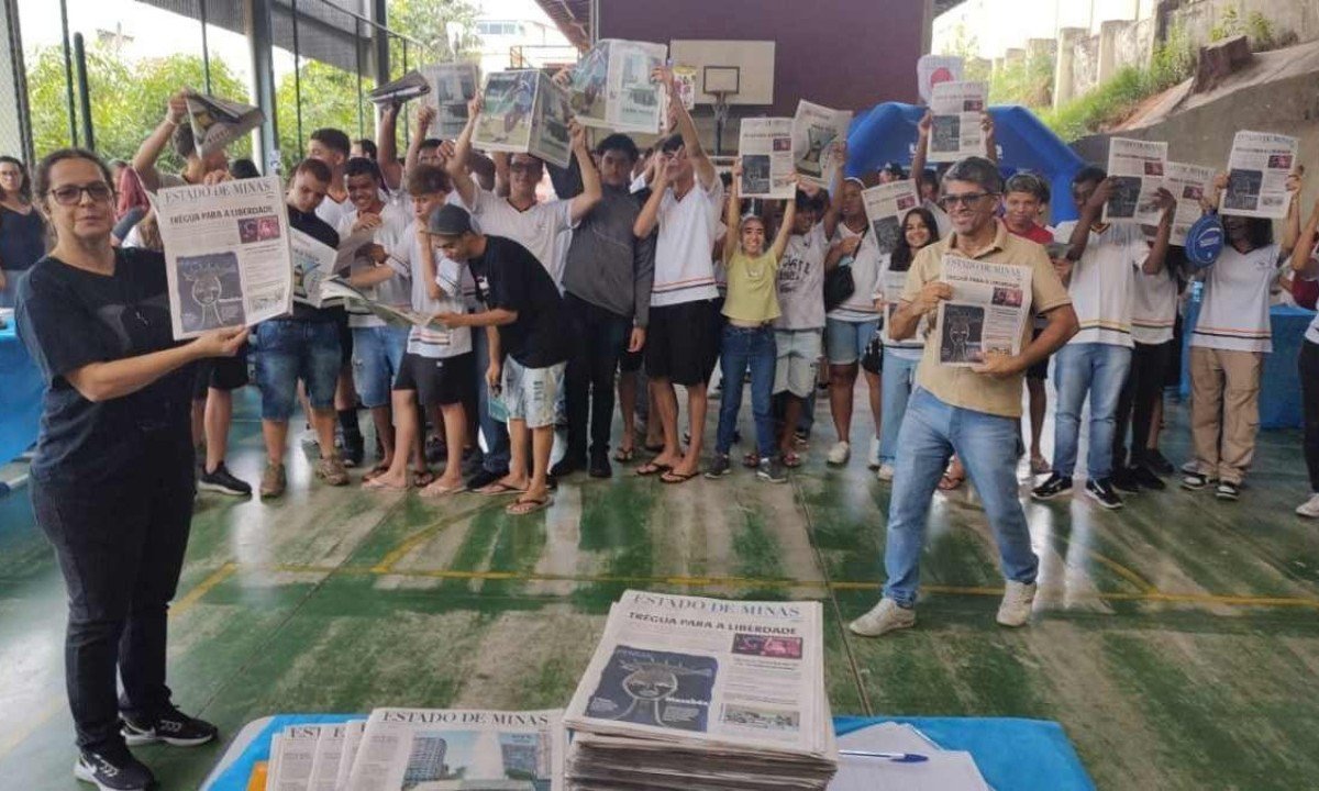 PARTICIPAÇÃO Os adolescentes receberam exemplares do jornal Estado de Minas e alguns brindes para serem sorteados durante o evento. Eles também têm apoio da Rede Cidadã, com um curso de Jovem Aprendiz e acesso ao primeiro emprego. “Depois da leitura dos jornais, a mente deles ficou mais aberta”, disse Margareth, ao lado do diretor da escola, Humberto Freitas, do vice-diretor, Sebastião Gessy, da supervisora, Sandra Nolasco, e da coordenadora de ensino médio, Alessandro Andrade.