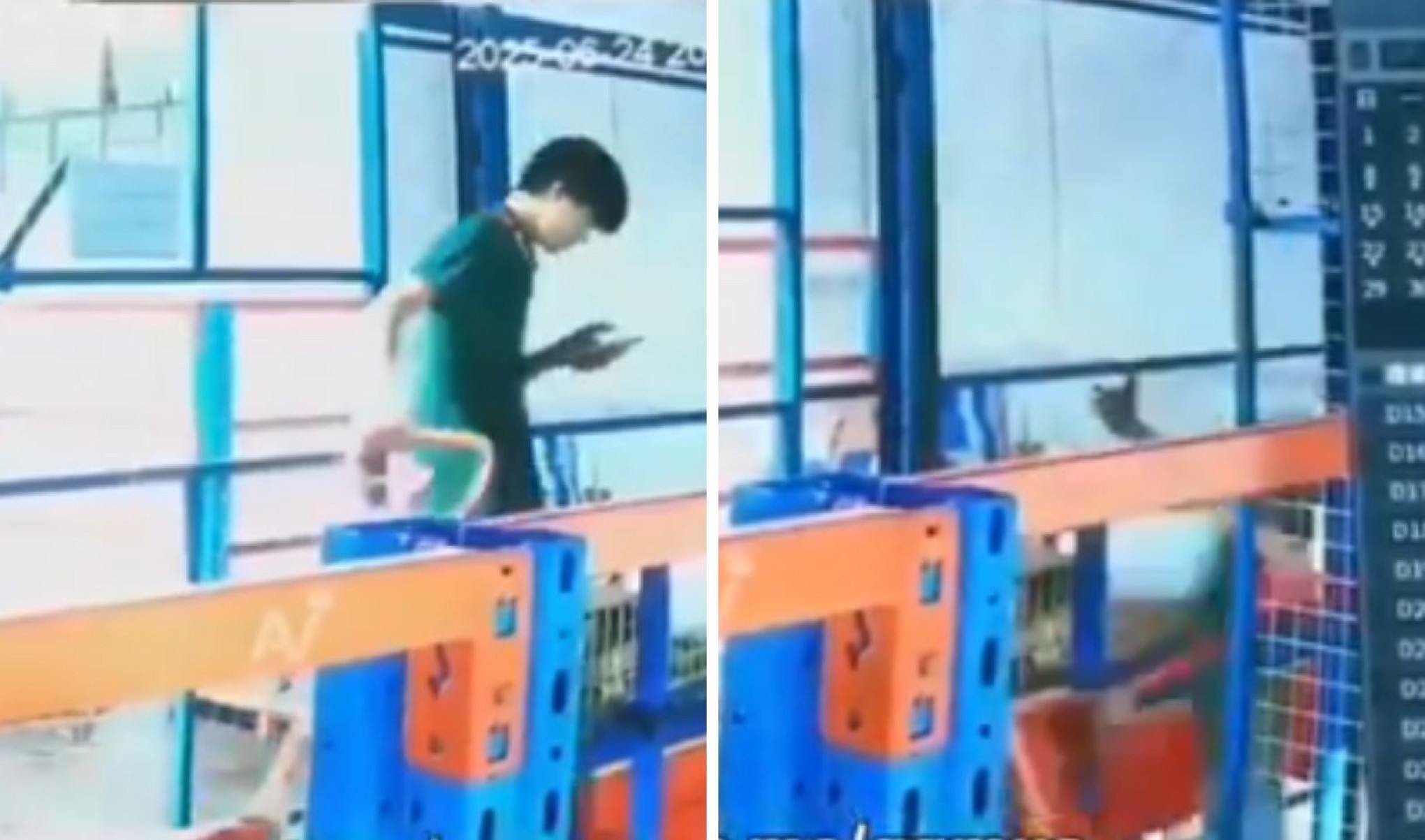 Um acidente impressionante em uma fábrica na cidade de Xiaolan, província de Guangdong, na China, chamou atenção nas redes sociais. Um trabalhador caiu no poço de um elevador enquanto manuseava um maquinário e usava o celular, distraído. O incidente aconteceu por volta das 20h do último dia 24 de junho e foi registrado por câmeras de segurança. Ele caiu de uma altura equivalente ao segundo andar.