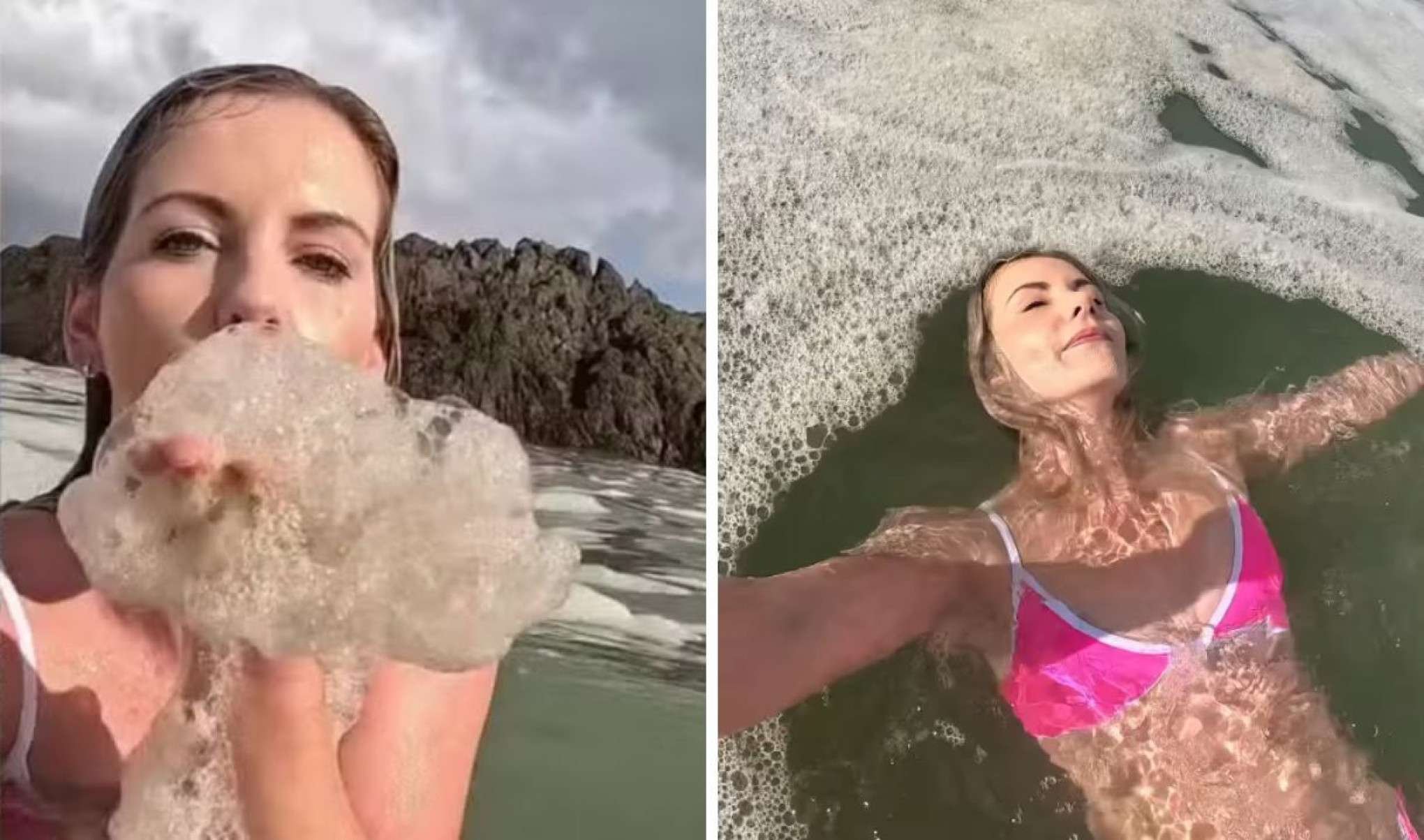 No vídeo, com milhões de visualizações no TikTok, Michelle aparece mergulhando e brincando com a espuma do mar — de aparência escura e turva — e chega até a comentar sobre o gosto da água. “Isso é salgado”, disse, sem saber que a água continha dejetos.