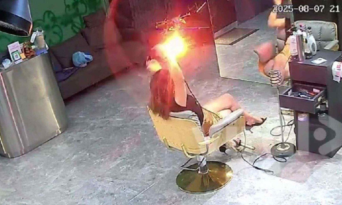 O secador de cabelo explodiu repentinamente, transformando-se em uma bola de fogo, enquanto estava sentada em sua cadeira. O momento foi registrado pelas câmeras de segurança do salão.