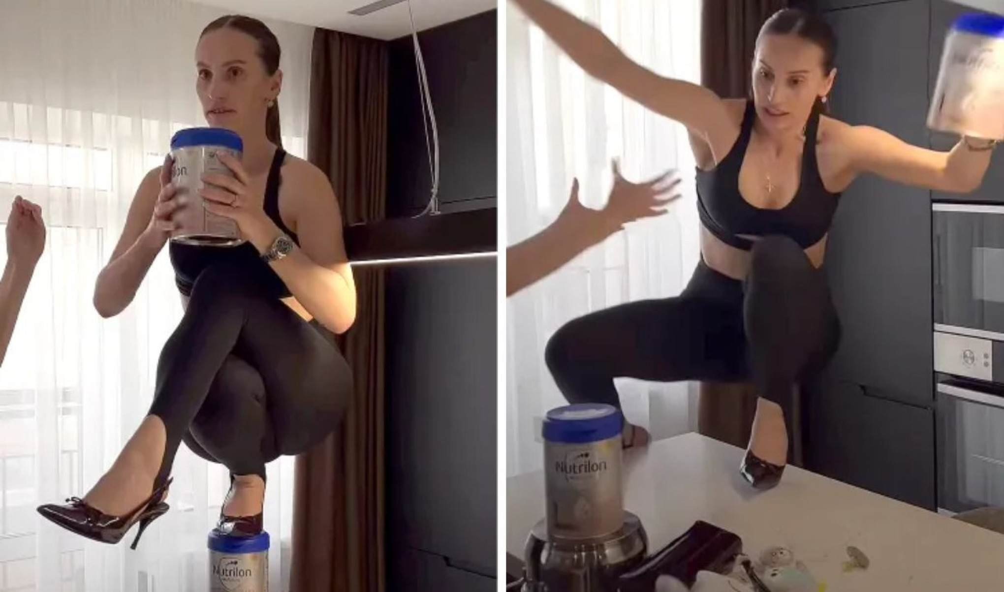 No vídeo, que rapidamente se espalhou pelas redes sociais, Mariana, usando saltos altos, aparece tentando se equilibrar em cima de um pote de fórmula infantil, empilhado sobre uma panela. Com a ajuda de outra pessoa, ela tenta subir em um balcão da cozinha. Mas, ao soltar a mão de apoio, a panela escorrega e ela cai com força de costas.