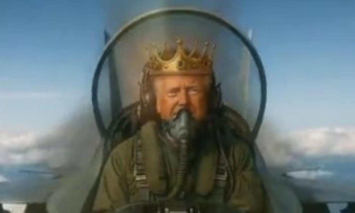 Zombando das manifestações, o presidente americano publicou um vídeo feito por inteligência artificial. As imagens mostram Trump em uma aeronave militar, com os dizeres “Trump king” (Trump rei). Depois, o líder aparece vestindo uma coroa.