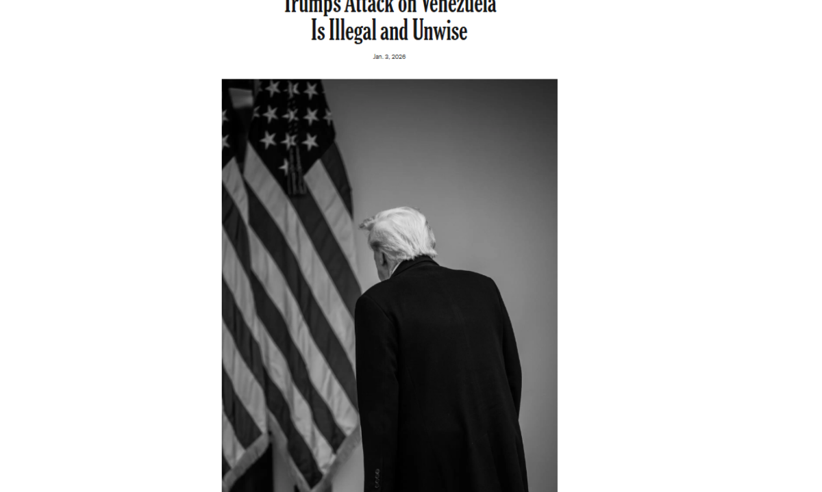 "Ilegal" e "imprudente" foram as palavras usadas no título do editorial do The New York Times (NYT) deste sábado (3/1), horas após o presidente norte-americano, Donald Trump, assumir a autoria de uma operação militar em Caracas, capital da Venezuela, que resultou resultou na captura do presidente Nicolás Maduro.