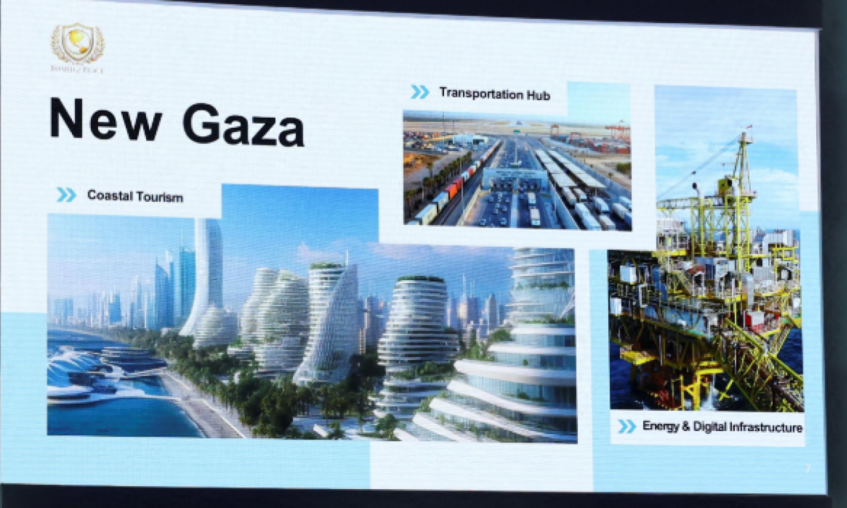 Uma série de slides mostra dezenas de arranha-céus ao longo da costa do Mediterrâneo e bairros residenciais na zona de Rafah, no sul da Faixa de Gaza. E um mapa indica o empreendimento por fases, com novas zonas residenciais, agrícolas e industriais para os 2,1 milhões de habitantes do território.