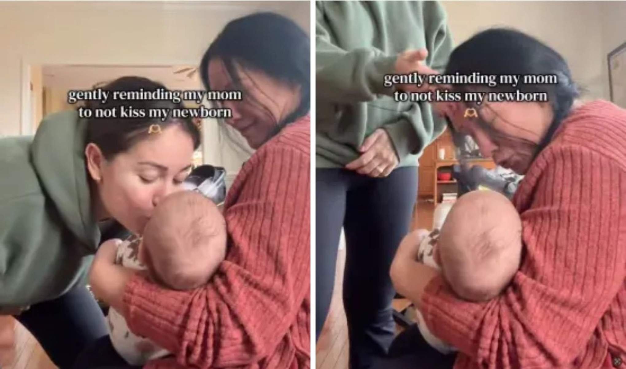 Nas imagens, Christiansen aparece beijando o filho na testa enquanto a avó o embala no colo. Quando a mulher se inclina para repetir o gesto, a mãe estende a mão e dá um leve “tapa” na cabeça dela, interrompendo a tentativa. Na legenda do vídeo, Christiansen escreveu: “Lembrando gentilmente minha mãe para não beijar o recém-nascido”. “A palavra do dia é ‘limites’”, completou na legenda.