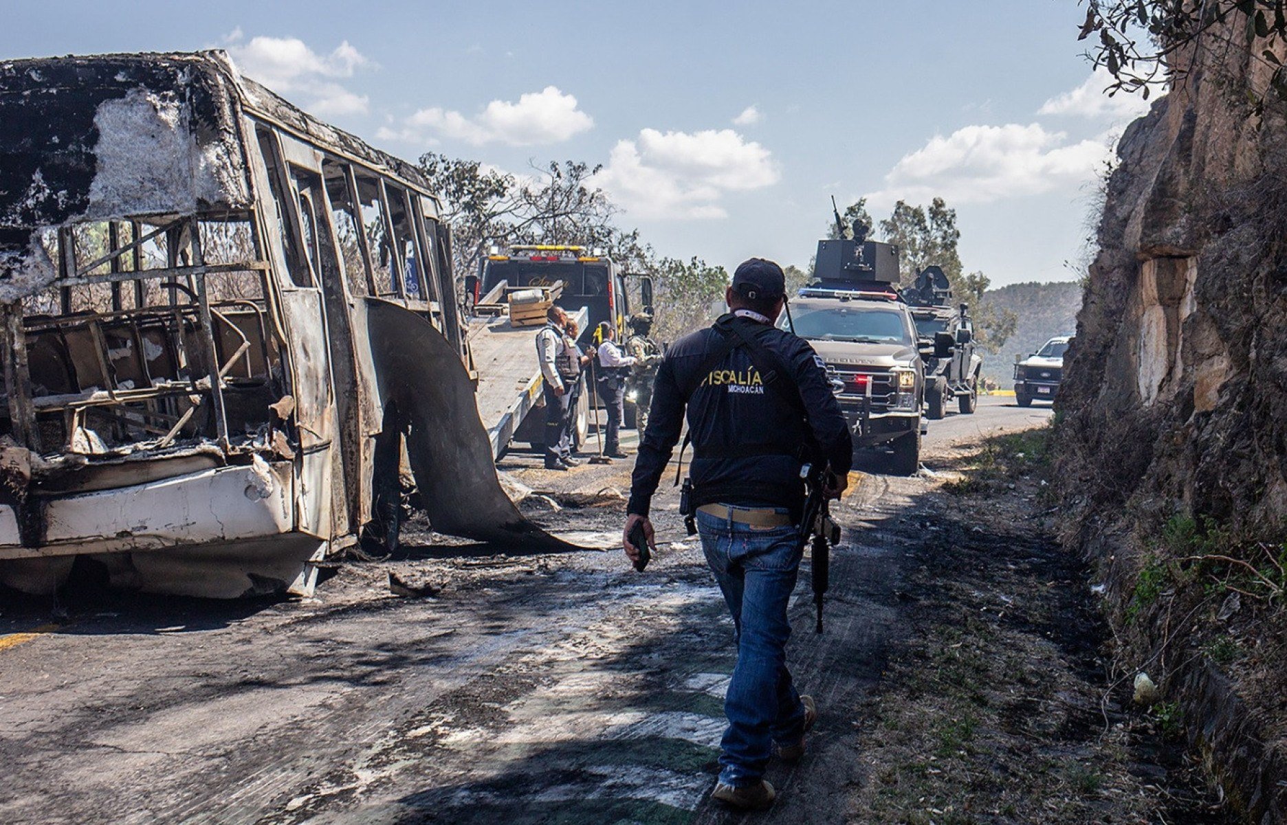 Homens armados bloquearam com carros e caminhões incendiados diversas vias de Jalisco. À tarde, eram visíveis restos de veículos carbonizados e outros ainda em chamas em várias rodovias, em meio ao som das sirenes das forças de segurança.