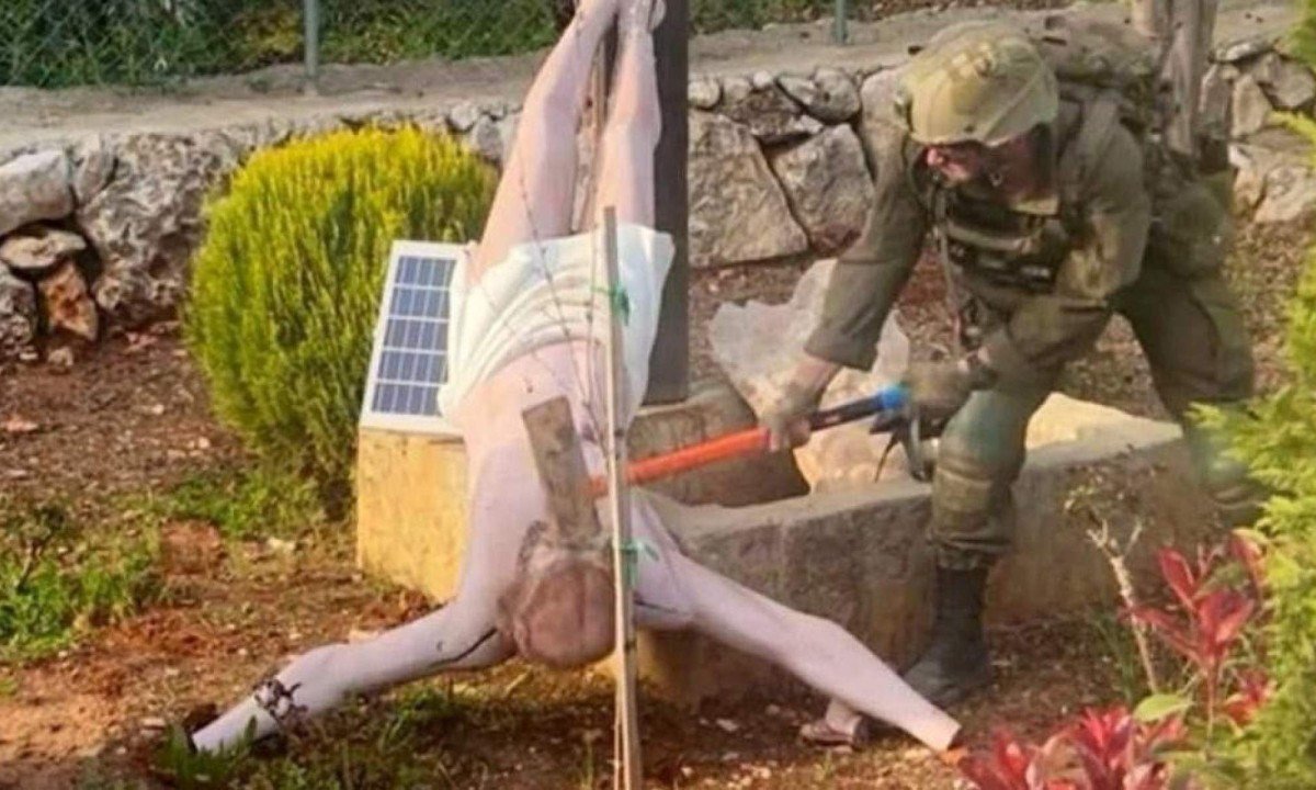 Uma imagem de um soldado israelense aparentemente golpeando uma estátua de Jesus Cristo com uma marreta no sul do Líbano gerou grande revolta após se espalhar nas redes sociais.