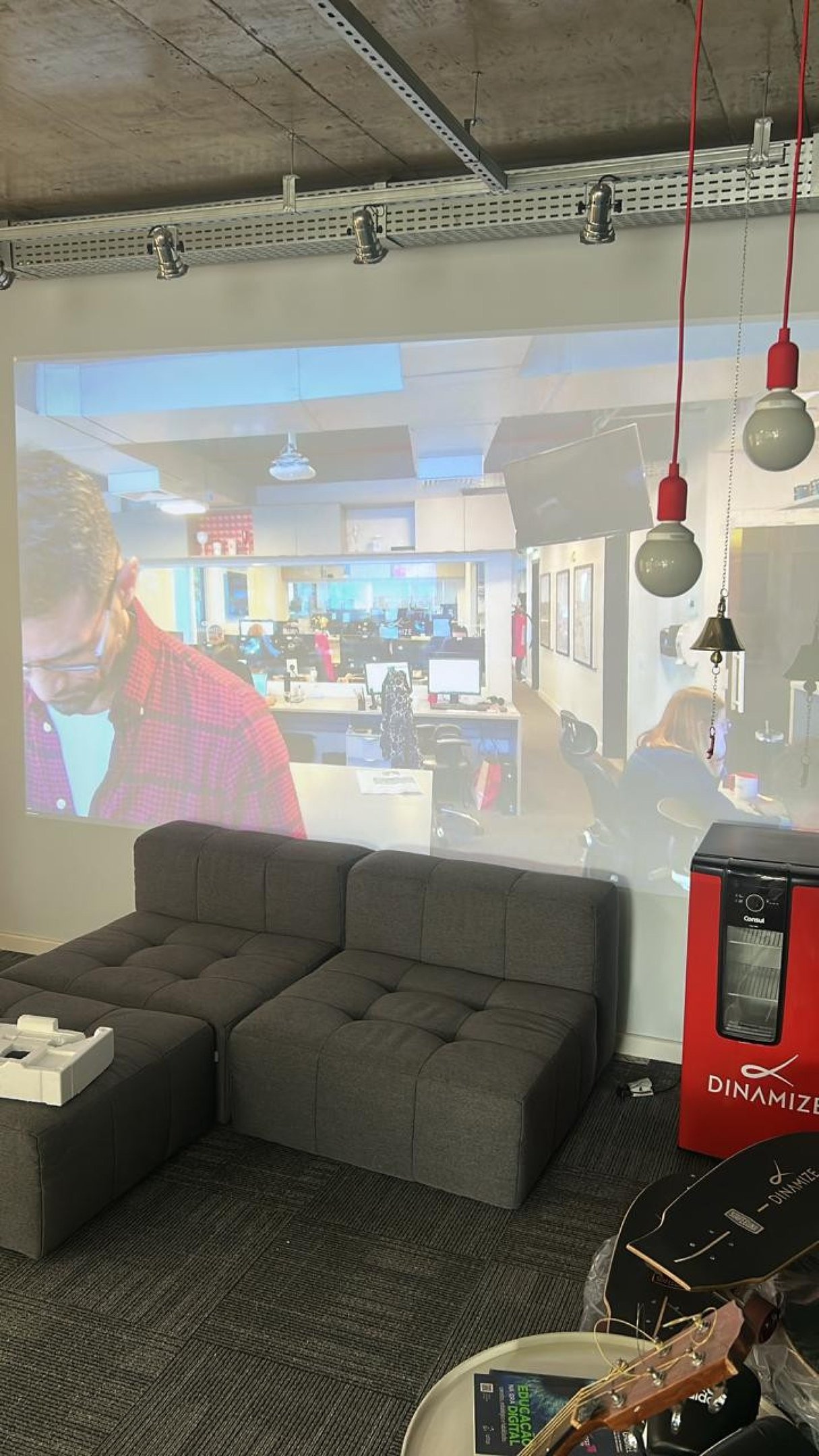 A Dinamize, plataforma do setor de automação de marketing, implementou um sistema de projeção em tempo real com o objetivo de integrar fisicamente suas unidades localizadas em São Paulo e Porto Alegre. A estrutura utiliza painéis de vídeo e áudio instalados em paredes inteiras de cada filial, operando como uma interface contínua de comunicação visual e sonora entre os dois ambientes.