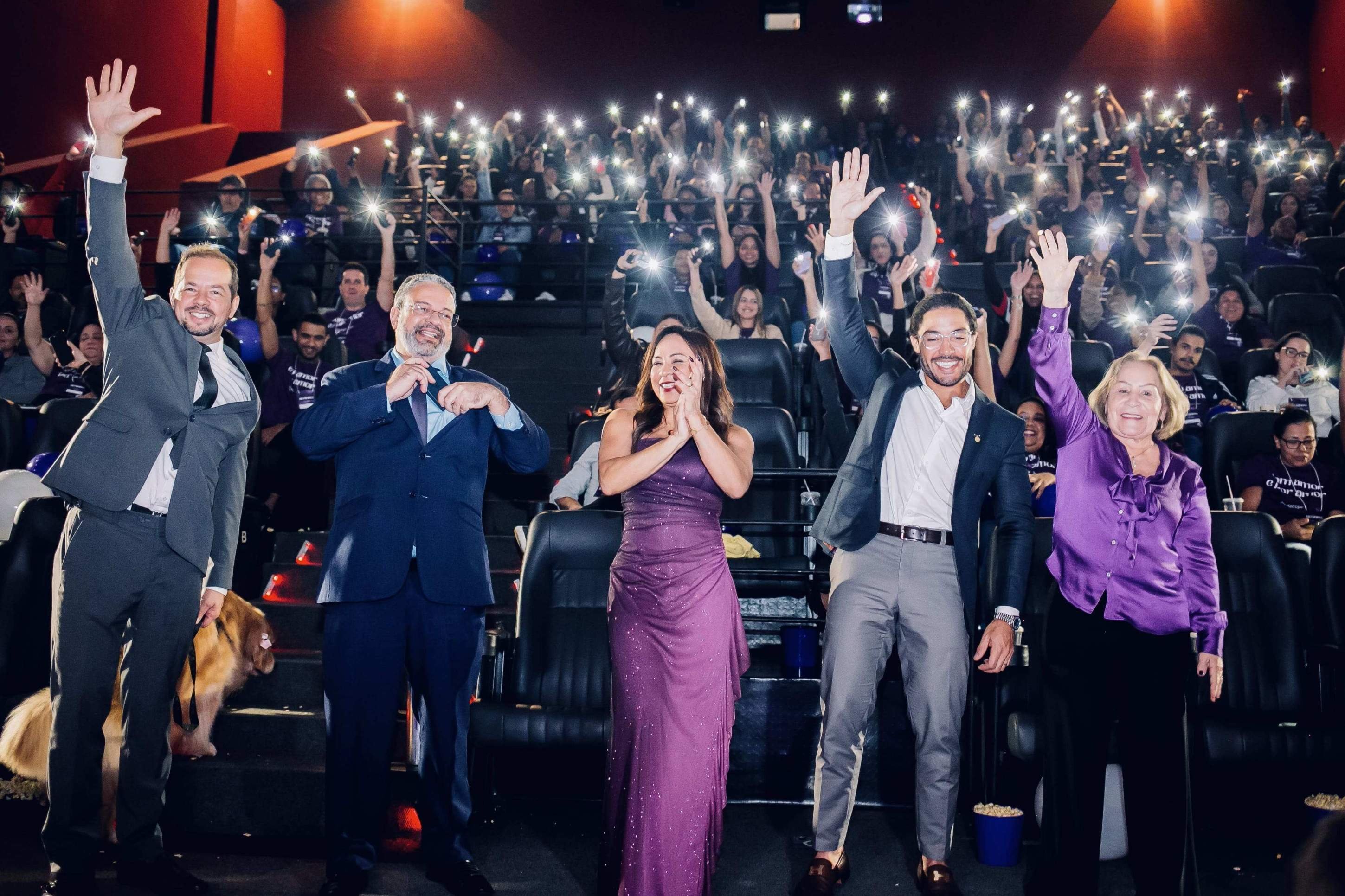 Dali, eles seguiram em cortejo até o cinema do Shopping Boulevard, reservado exclusivamente para o evento. No hall de entrada, os convidados foram recebidos com pipoca, refrigerante, espaço instagramável para fotos e anúncios de um filme especial que em breve assistiriam.