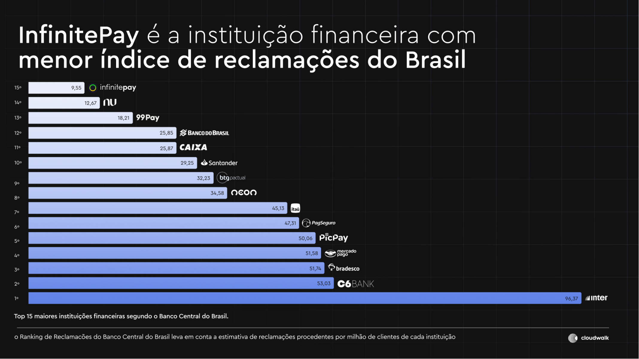 A InfinitePay, plataforma de serviços financeiros para micro e pequenos empreendedores da CloudWalk, encerrou o trimestre com um feito: é a que apresentou o menor índice de reclamações de clientes entre as maiores instituições financeiras do Brasil, segundo o ranking oficial do Banco Central.
