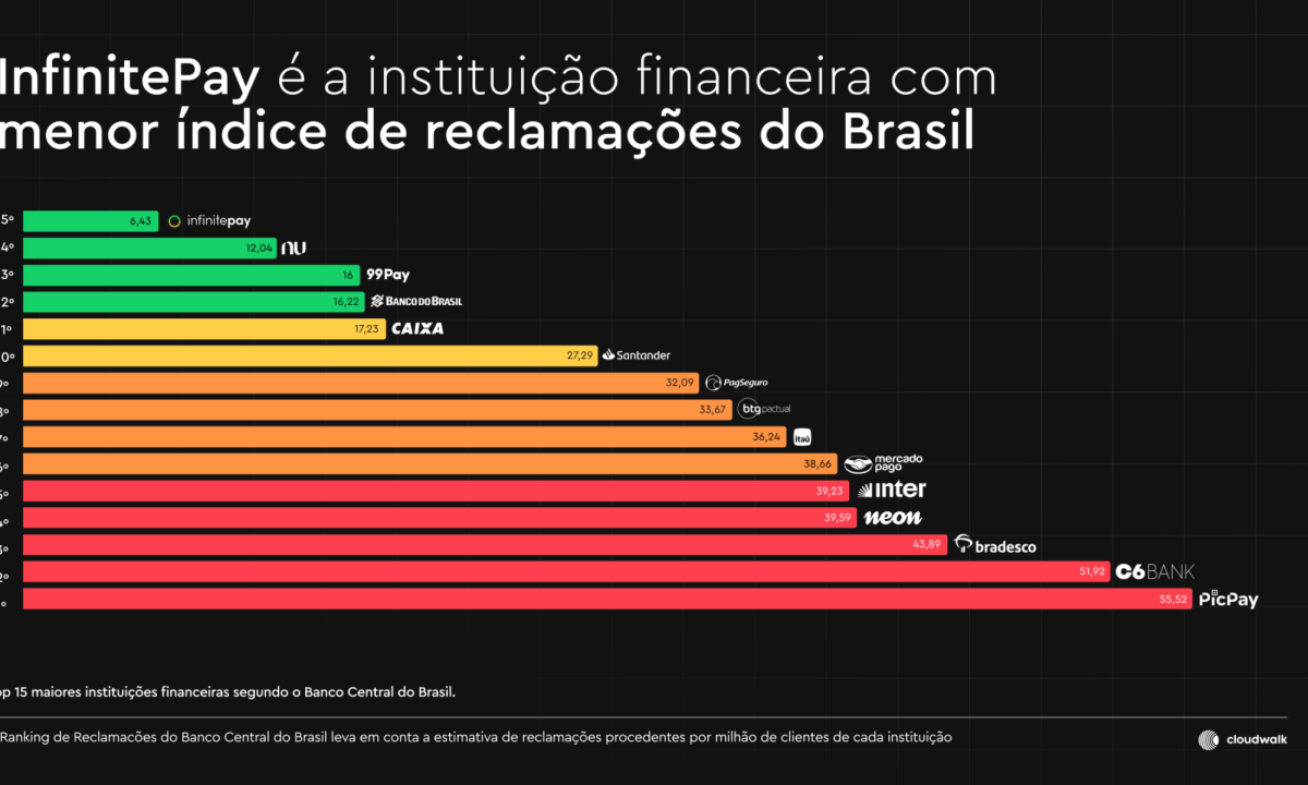 No período, a InfinitePay registrou um índice de reclamações de 6,43, ainda menor do que o patamar observado no trimestre anterior — também o mais baixo entre a concorrência. O ranking do Banco Central considera a estimativa de reclamações procedentes por milhão de clientes de cada instituição.