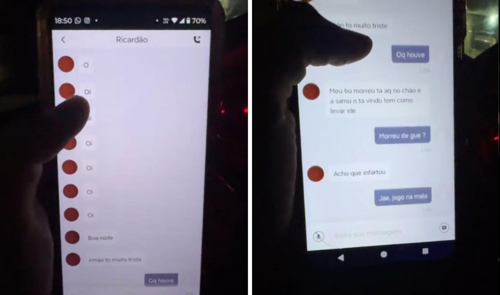 “Meu tio morreu, tá aqui no chão. E o Samu não tá vindo. Tem como levar ele?”, pede o cliente. O motorista pergunta a causa da morte. O Ricardão diz que acha que é infarto.