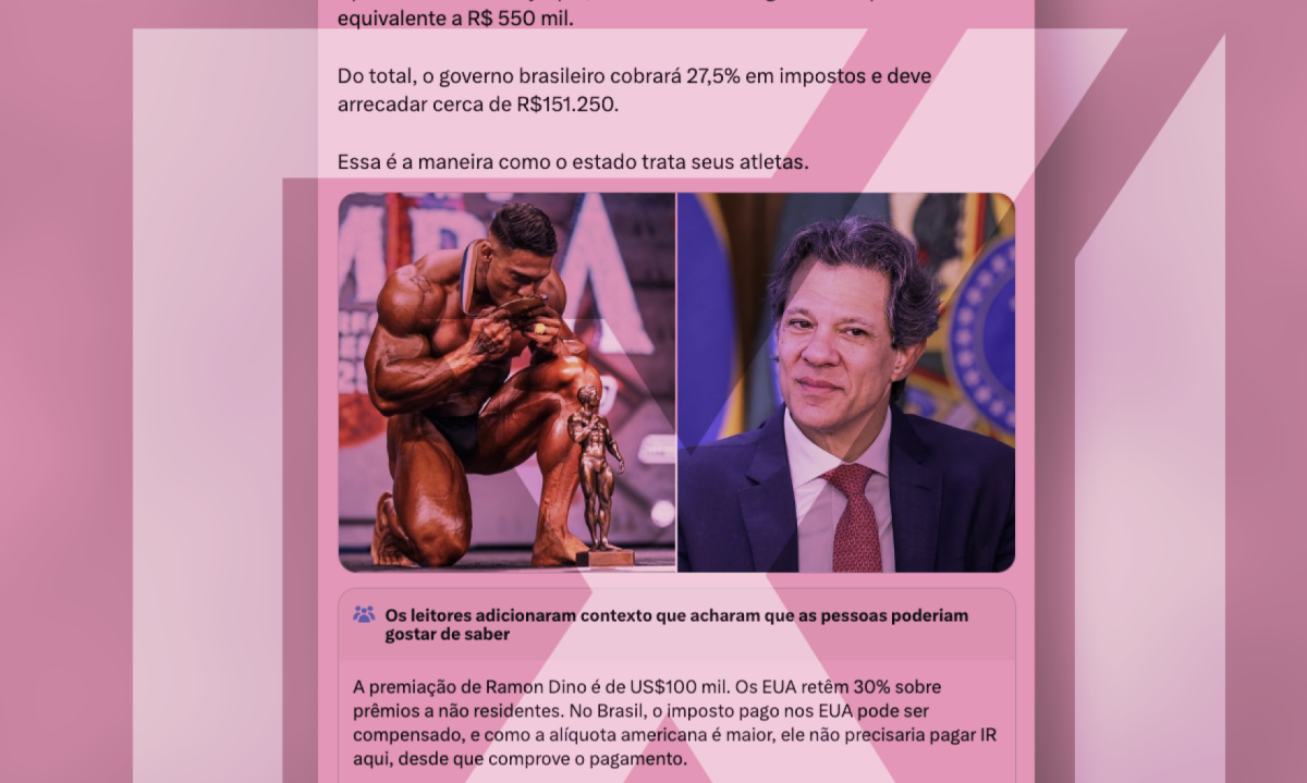 A publicação analisada induz o público à crença de que o governo brasileiro teria taxado o prêmio do fisiculturista Ramon Dino, quando, na realidade, trata-se da aplicação normal das regras de tributação internacional. O caso envolve dois sistemas distintos — o dos Estados Unidos, onde o prêmio foi pago, e o do Brasil, onde o atleta é residente fiscal. O advogado tributarista Carlos Eduardo Navarro, ouvido pelo Comprova, explicou que a premiação recebida no exterior é considerada rendimento tributável no Brasil, devendo ser declarada como tal, ainda que o imposto já tenha sido pago em outro país.