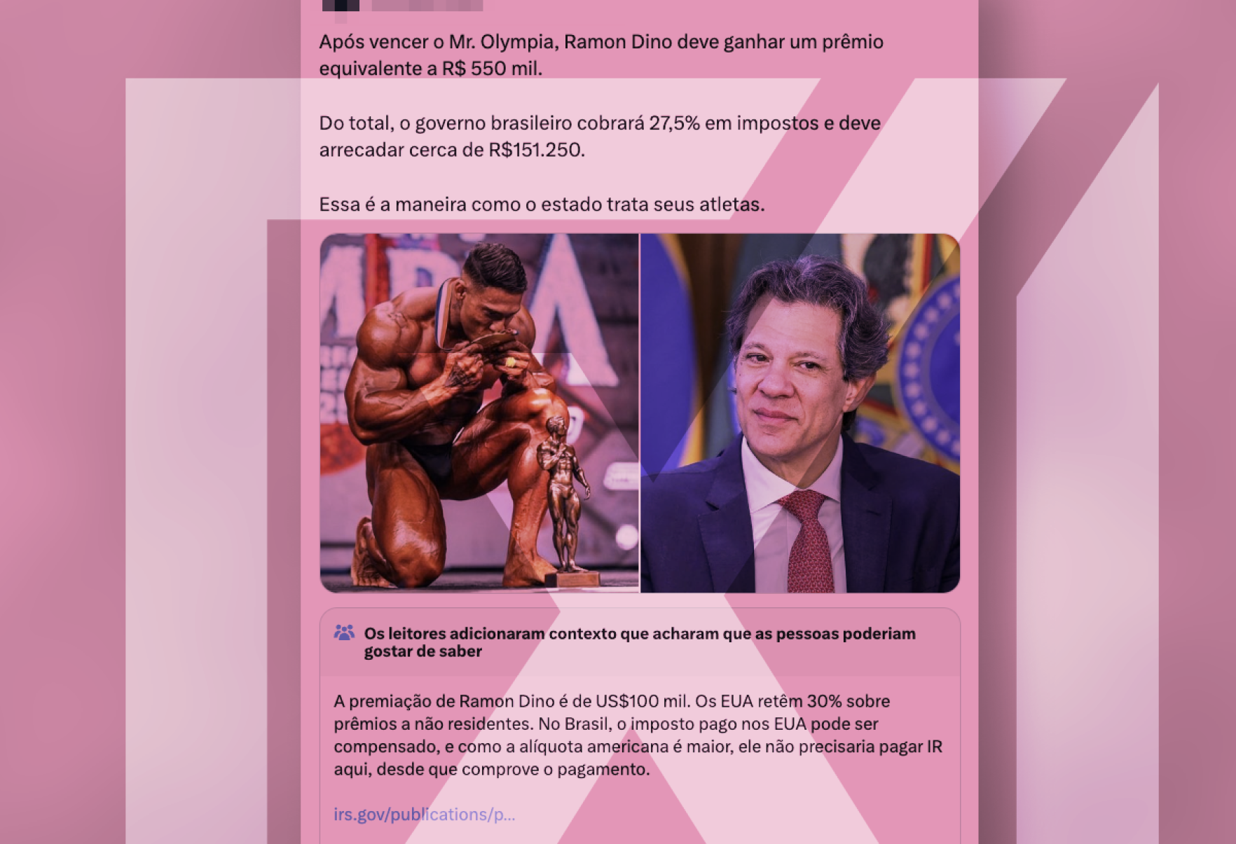 A postagem analisada mostra uma montagem com fotos de Fernando Haddad e Ramon Dino, acompanhada do texto: “Após vencer o Mr. Olympia, Ramon Dino deve ganhar um prêmio equivalente a R$ 550 mil. Do total, o governo brasileiro cobrará 27,5% de impostos. Essa é a maneira como o Estado trata seus atletas”. Ela distorce um dado verdadeiro — a existência da alíquota máxima do Imposto de Renda Pessoa Física (IRPF) — ao atribuir falsamente ao ministro a criação ou imposição dessa cobrança. A regra é antiga, prevista em lei desde 1998, e se aplica a todos os contribuintes brasileiros, sem relação com decisões recentes do governo. No entanto, o prêmio foi pago nos Estados Unidos, país que retém 30% de imposto de renda na fonte sobre valores pagos a artistas e atletas estrangeiros, conforme a Publicação 515 (2025) e o Form 1042-S do Internal Revenue Service (IRS), órgão equivalente à Receita Federal americana.