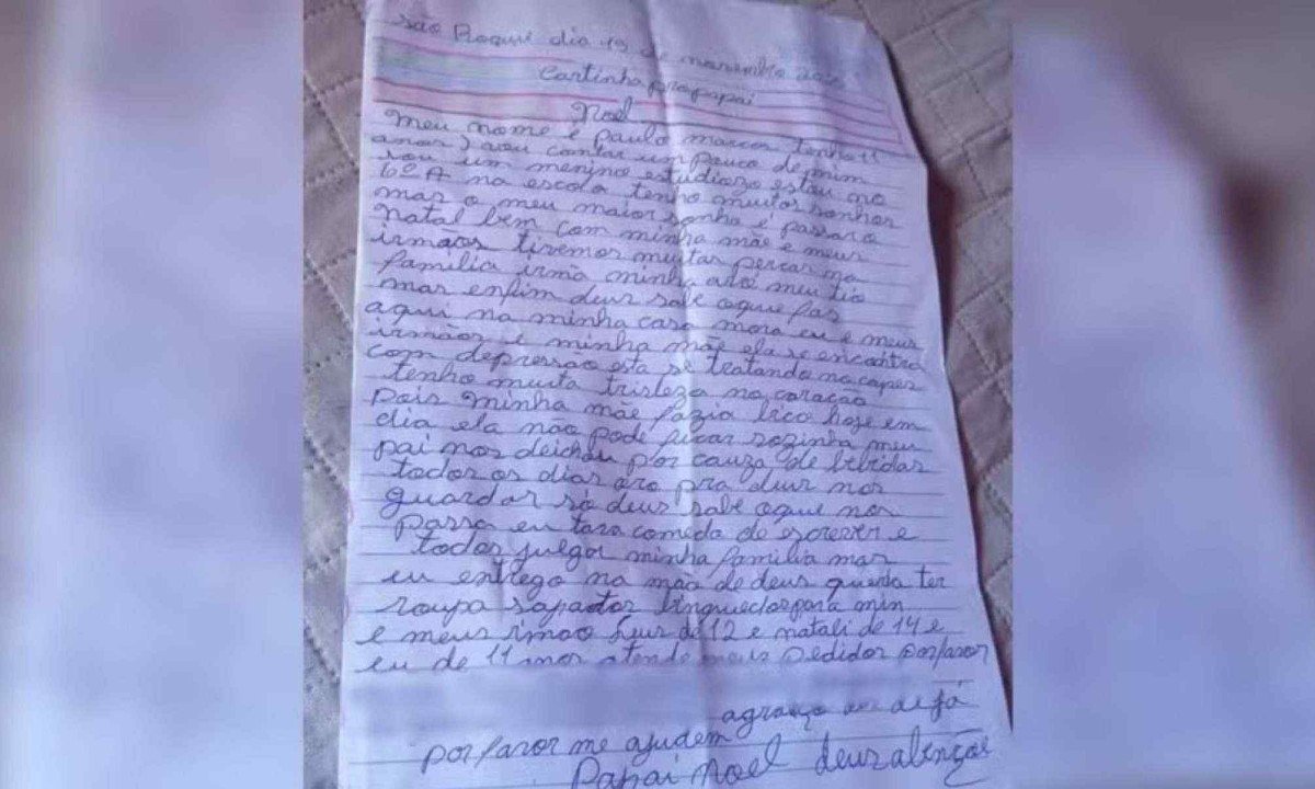 Na carta endereçada ao Papai Noel, Paulo relatou sua realidade com sinceridade. “Tenho muitos sonhos, mas o meu maior sonho é passar o Natal bem com a minha mãe e meus irmãos. Tivemos muitas perdas na família. Irmã, avó e até meu tio. Aqui na minha casa mora eu, meus irmãos e minha mãe. Ela se encontra com depressão, está se tratando no CAPS (Centro de Atenção Psicossocial)”, escreveu.