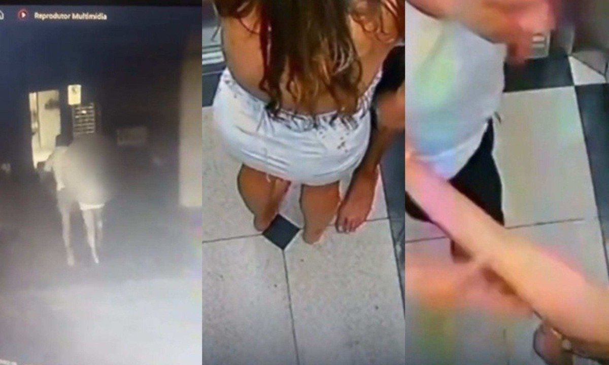 Dentro do elevador, é possível ver a moça abraçada ao homem tentando, aparentemente, acalmá-lo. Logo depois, ele se aproxima para agarrar o pescoço dela. Em menos de dois minutos, ele a retira do local de forma brusca. Ela tenta se segurar, mas não consegue. A imagem seguinte mostra ele retornando sozinho, enquanto coloca as mãos na cabeça e se senta, em sinal de desespero.