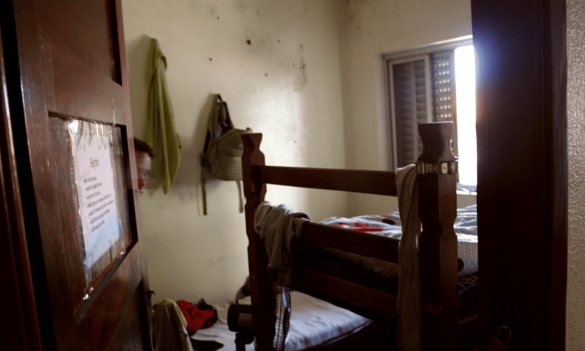 O sobrado branco grande fica na esquina do estabelecimento. Ali, dez homens dividiam um espaço de cerca de 70 m², com dois cômodos e uma sala enxuta compartilhada por três deles.