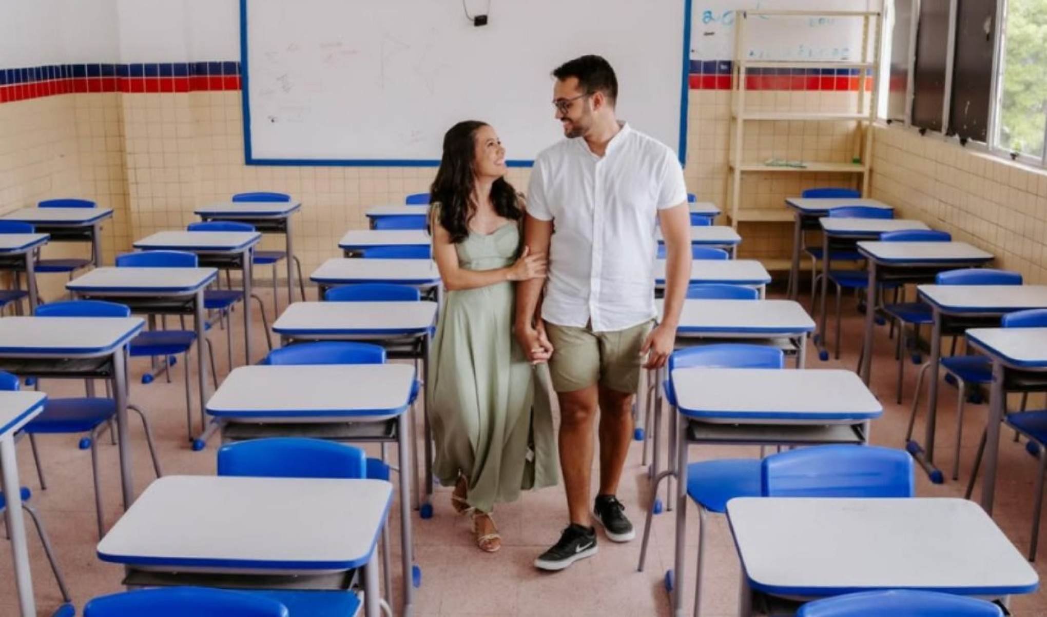 A ideia de realizar o ensaio no colégio partiu da noiva. Segundo ela, Diego ficou receoso no início, por ser mais tímido. “Meu esposo era muito tímido. Eu disse: ‘não, Diego, vamos tirar fotos na escola’”, relembrou.