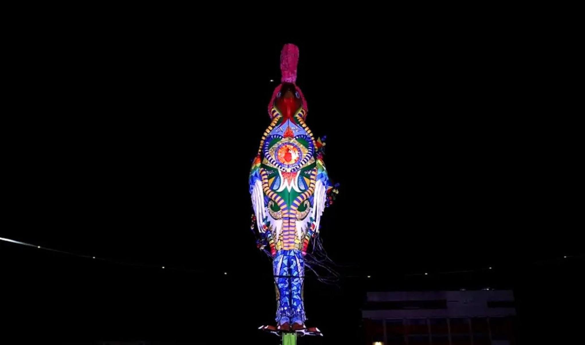 A primeira escultura de grandes dimensões associada ao Galo foi adotada apenas em 1995, em parceria com a prefeitura de Recife. Naquele ano, a alegoria foi instalada sobre uma balsa no rio Capibaribe, já perto da Ponte Duarte Coelho, marcando a incorporação de um elemento monumental ao desfile.