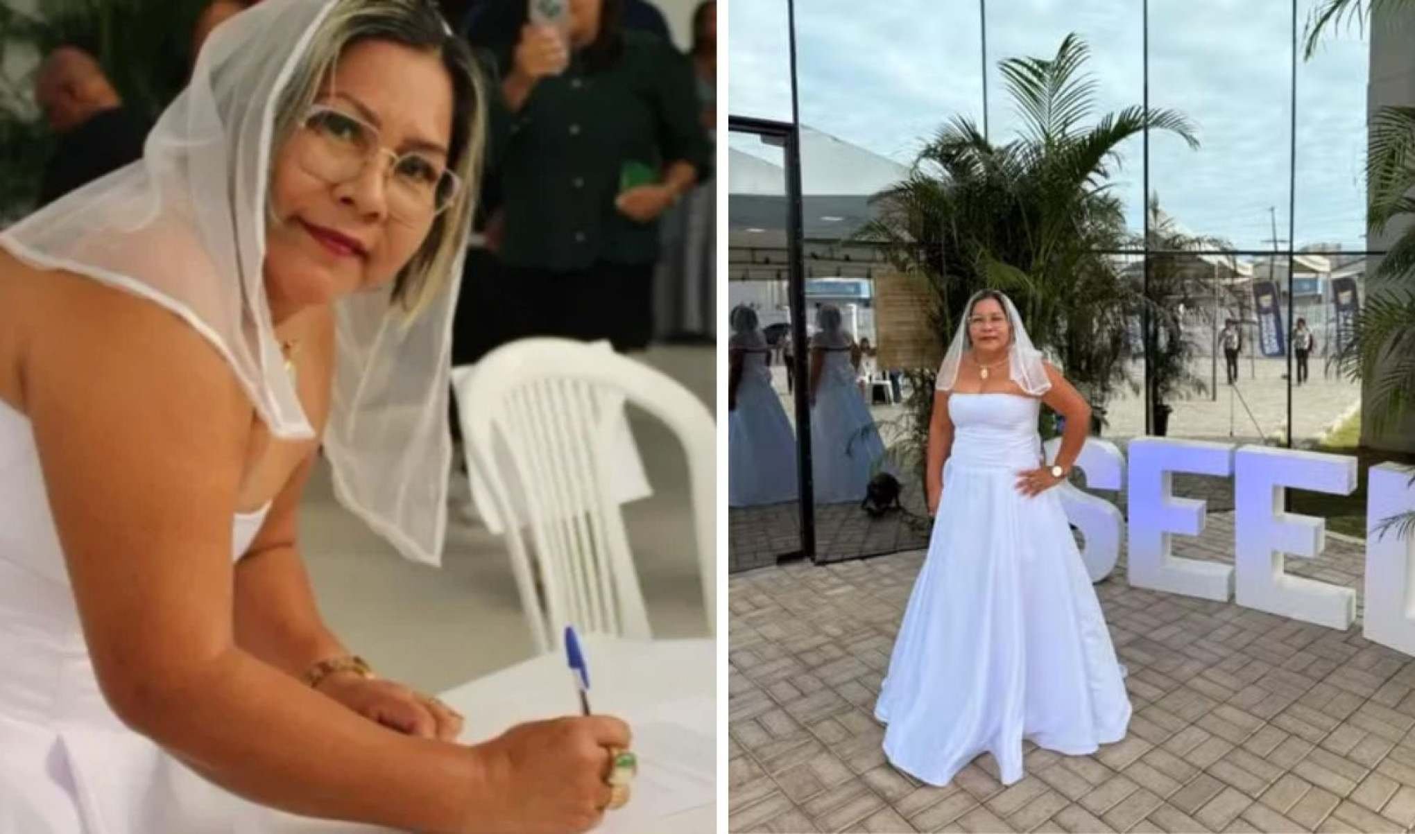 A pedagoga Nayra Saldanha, de 50 anos, chamou a atenção ao tomar posse em um concurso público para professora da educação básica da rede estadual de Roraima vestida de noiva. A cerimônia foi realizada em janeiro, na Secretaria de Educação de Roraima (Seed), em Boa Vista. As imagens viralizaram nas redes sociais.