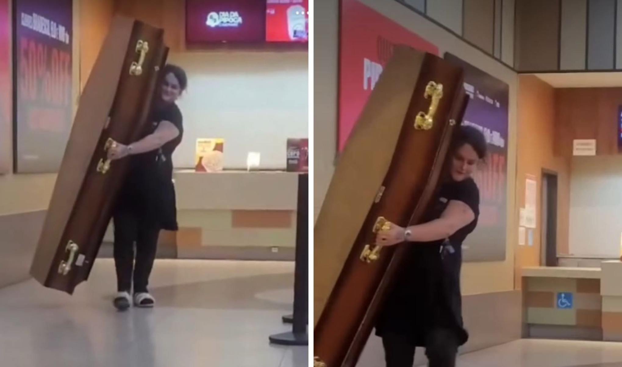 Para tentar aproveitar ao máximo a promoção, ela apareceu em um shopping carregando um caixão, acreditando que poderia usá-lo como recipiente para a pipoca.