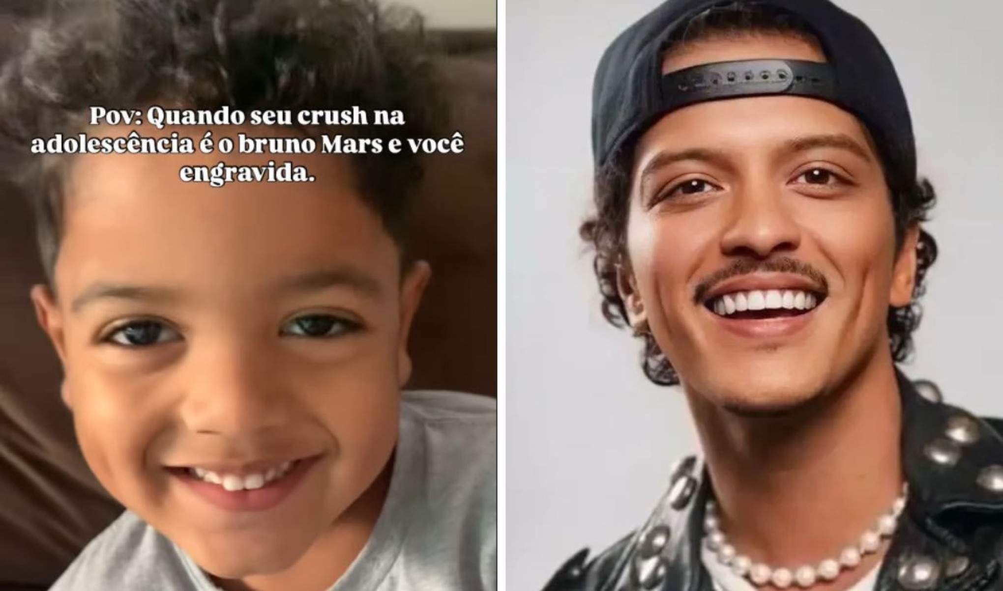 A postagem foi feita pela mulher de 29 anos na sexta-feira (13/3) e brinca com a aparência do pequeno Noah, de 3 anos. “POV: Quando seu crush da adolescência é o Bruno Mars e você engravida”, escreveu na legenda.