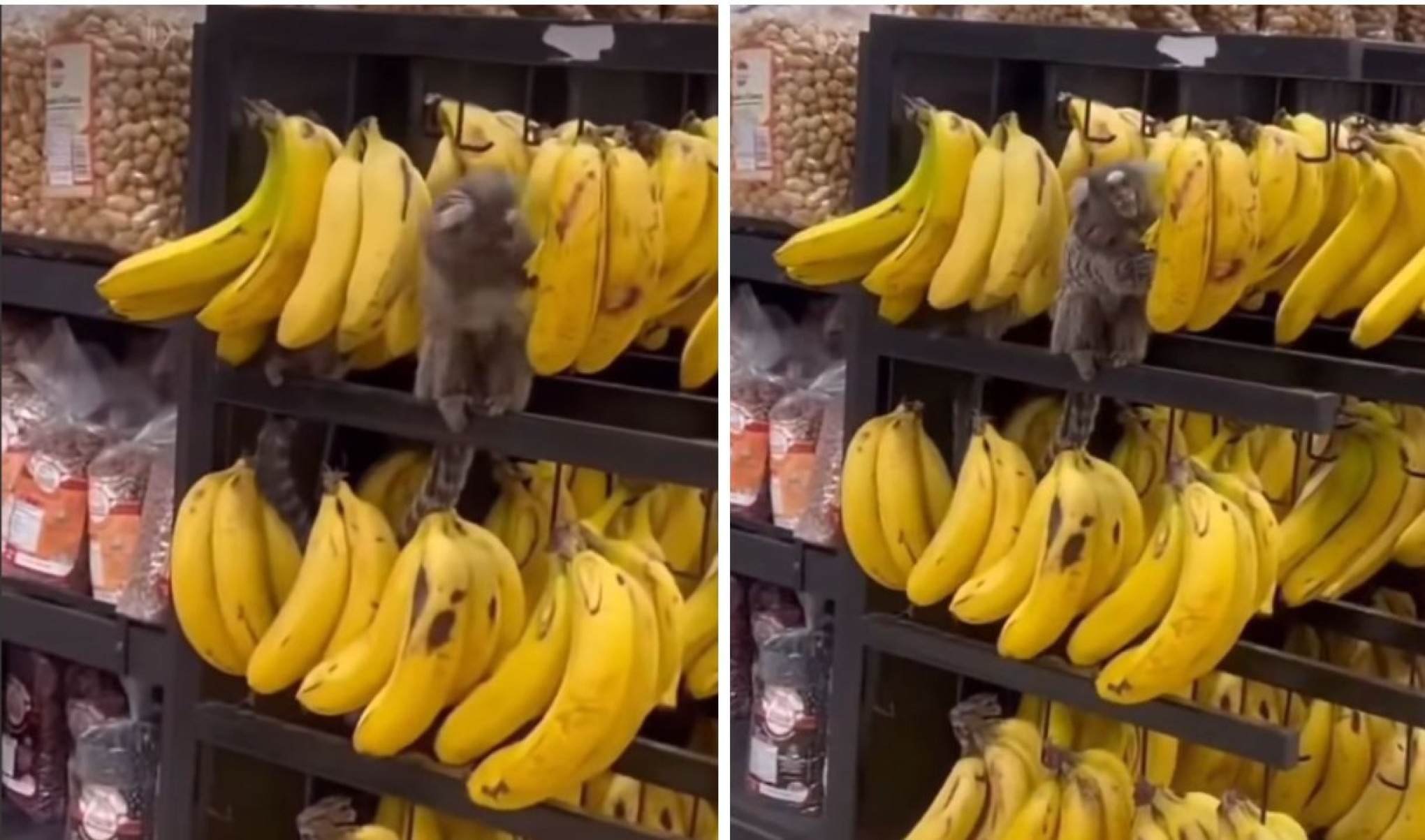 Dois saguis invadiram um supermercado em Cachoeiro de Itapemirim (ES) para fazer um lanchinho. Os animais foram flagrados na quinta-feira (26/3) atacando uma banca de bananas na seção de hortifruti do estabelecimento, que estava em funcionamento e recebendo clientes.