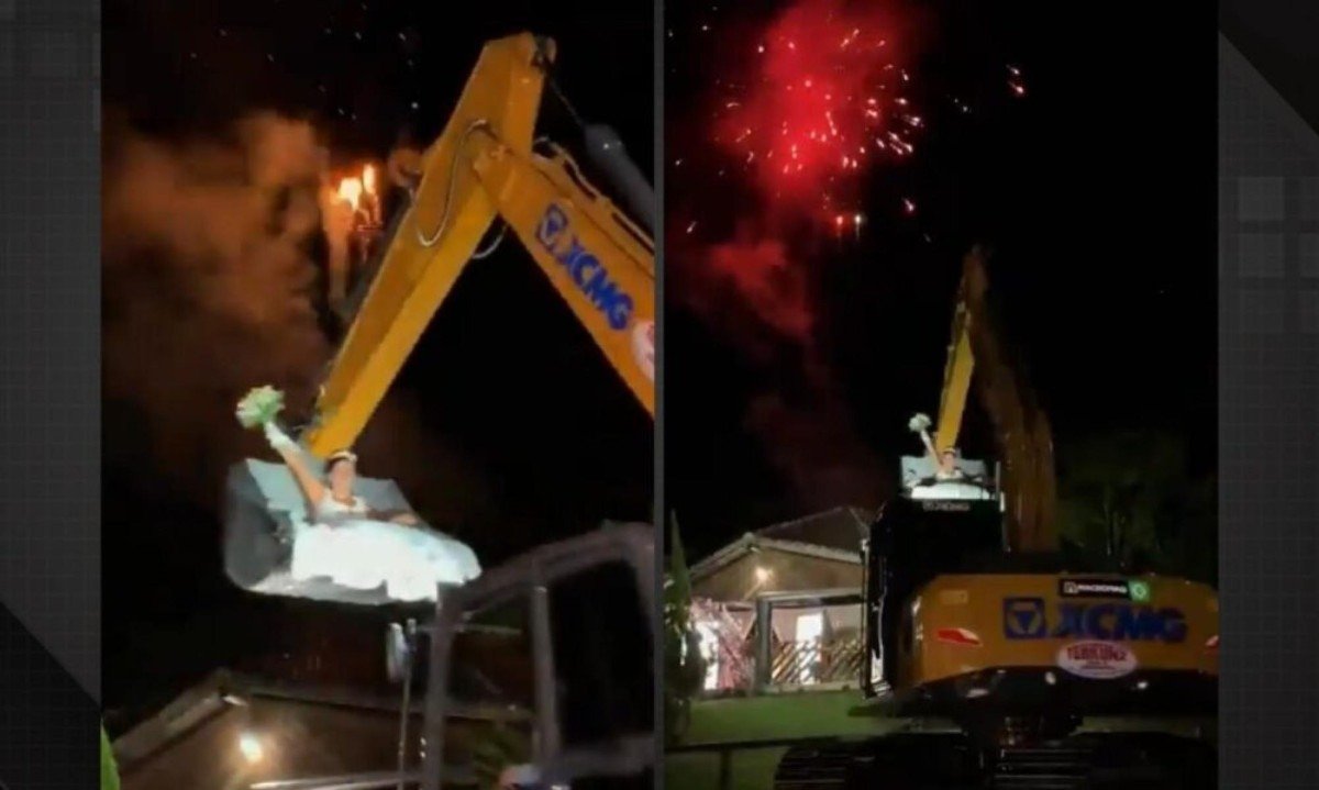 Uma noiva chamou atenção mais do que a habitual ao entrar no próprio casamento dentro da concha de uma escavadeira, em Antônio Carlos, na Grande Florianópolis, em Santa Catarina. O equipamento era operado pelo próprio noivo, Claudir Kunz, enquanto Fernanda Dalila Pereira girava no ar diante dos convidados.