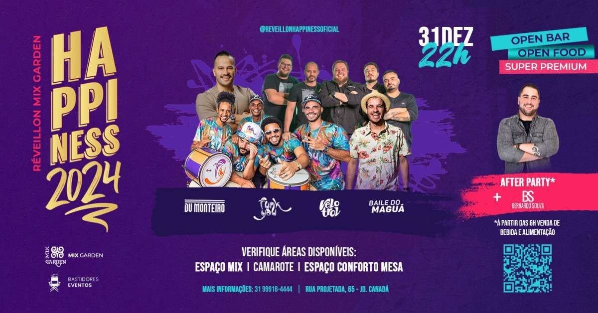 E, ainda, o pós do Réveillon Happiness será na after party de 06h às 10h com venda de comida e bebida e participação do sertanejo Bernardo Souza!