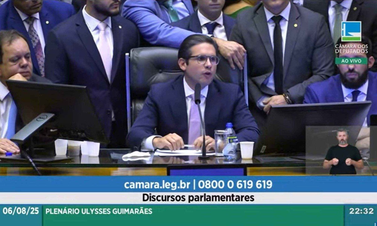 O presidente da Câmara dos Deputados, Hugo Motta (Republicanos-PB), fez um pronunciamento nesta quarta-feira (6/8), afirmando que projetos pessoais e eleitorais não devem se sobrepor ao Brasil, e declarou que a obstrução por meio da ocupação da Mesa Diretora não faz bem ao país.