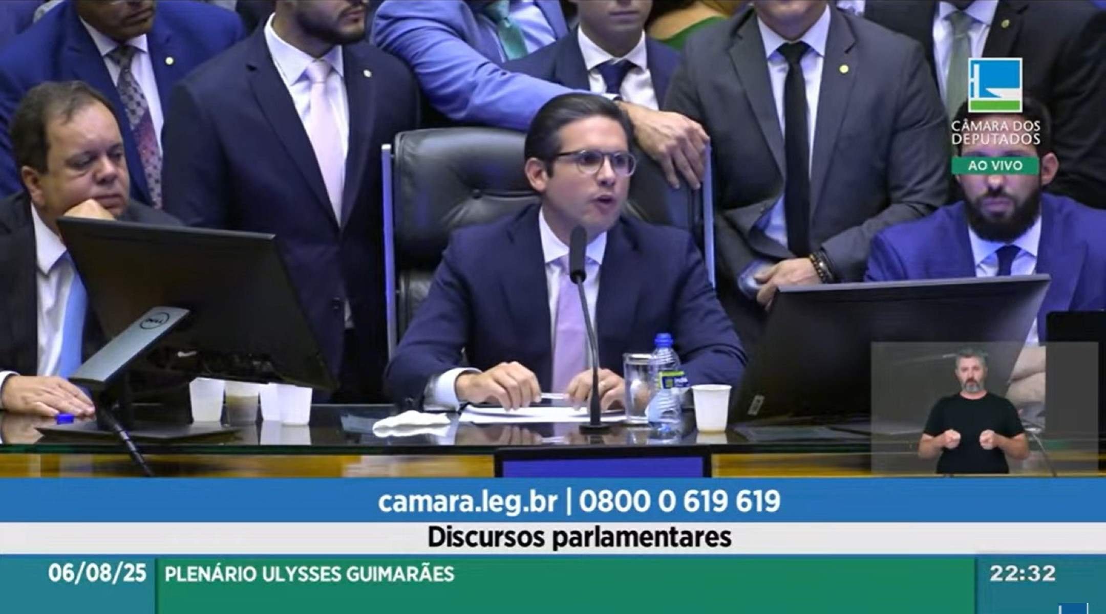 O presidente da Câmara dos Deputados, Hugo Motta (Republicanos-PB), fez um pronunciamento nesta quarta-feira (6/8), afirmando que projetos pessoais e eleitorais não devem se sobrepor ao Brasil, e declarou que a obstrução por meio da ocupação da Mesa Diretora não faz bem ao país.
