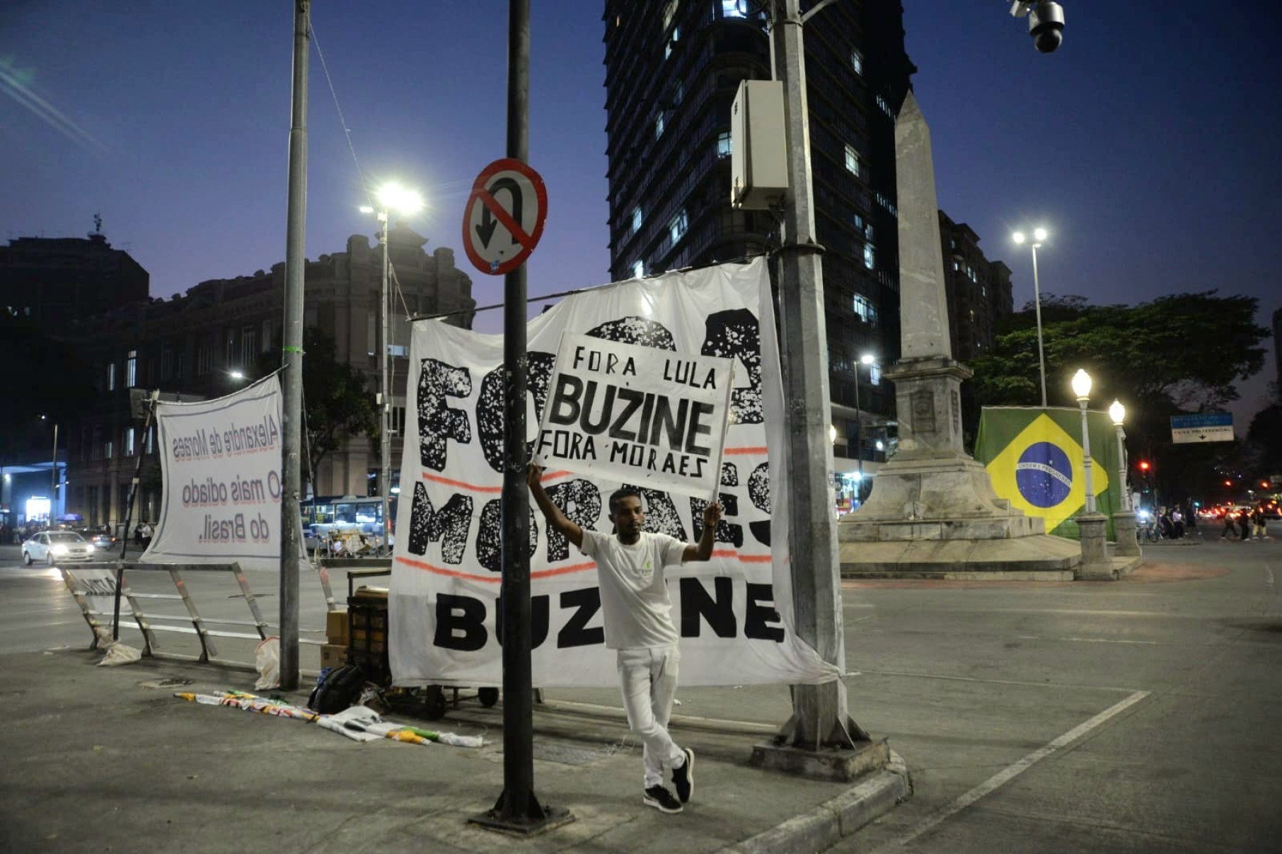 Faixas hostilizando o ministro Alexandre de Moraes e uma bandeira do Brasil foram afixadas, mas há poucas pessoas no local.