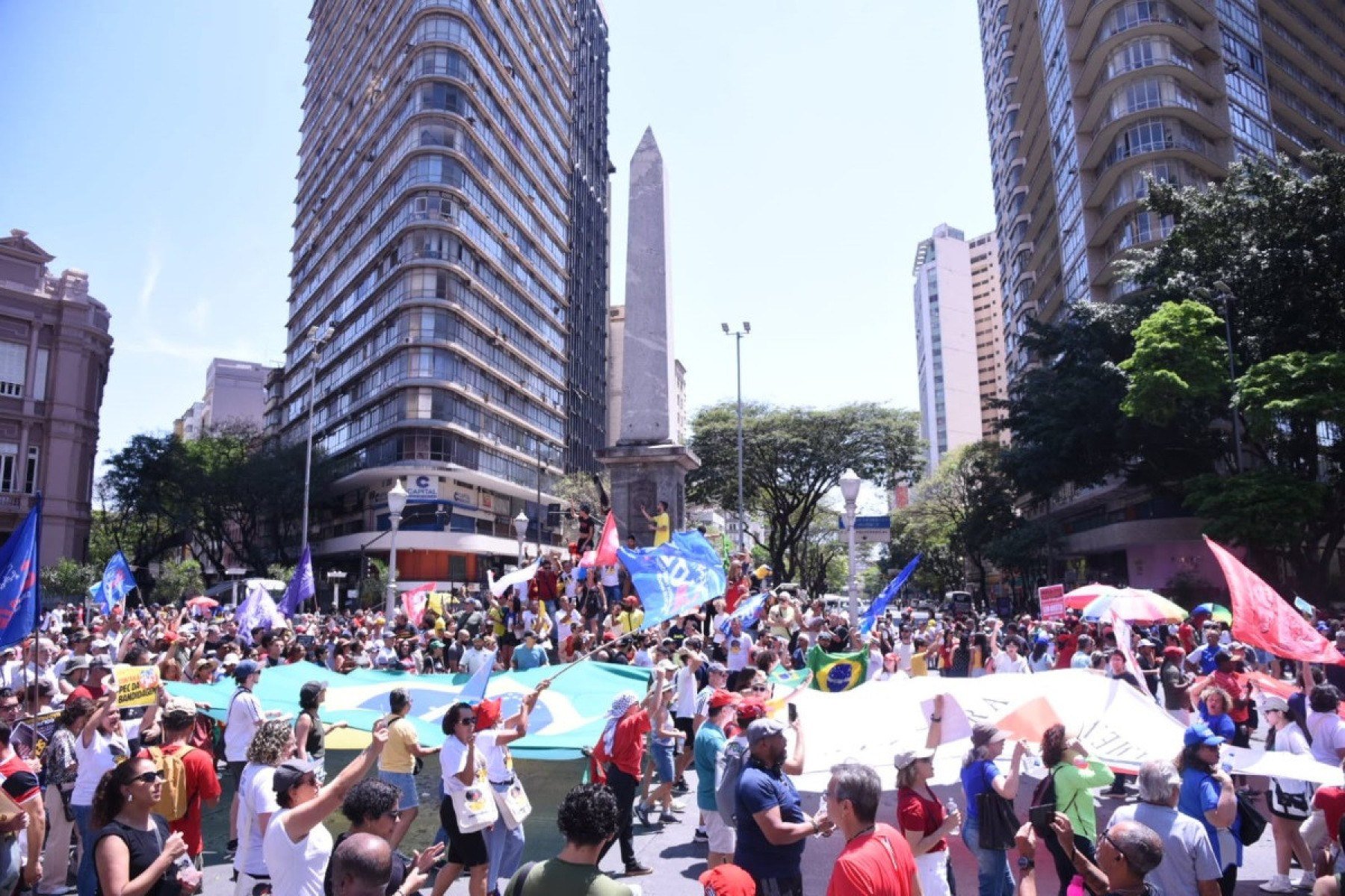 Em meio a cartazes, bandeiras e palavras de ordem, chamaram atenção os bandeirões do Brasil e de Minas Gerais, que seguiram com a caminhada, símbolo de luta pela Justiça no país. Uma bandeira gigante da Palestina também se destacou entre os manifestantes.