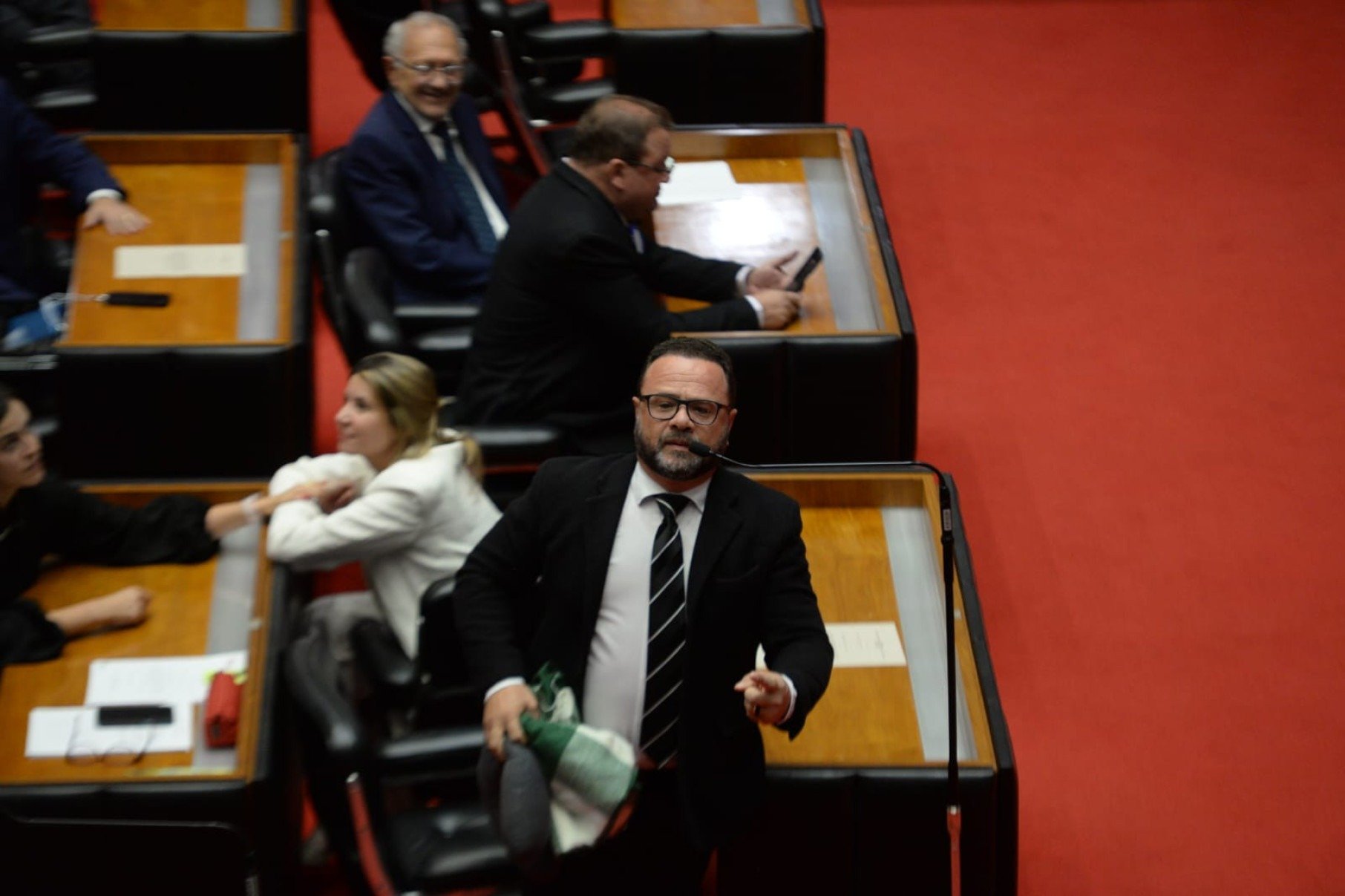 No início da sessão, o presidente da Assembleia, Tadeu Martins Leite (MDB), foi recebido aos gritos de “Tadeu traidor”, vindos das tribunas tomadas por servidores da Copasa em greve. Cartazes com frases, como “Deputados, 2026 tem eleição, não esqueçam!” e “Tirar o referendo é atacar o povo mineiro”, cobriam as laterais das galerias do plenário.