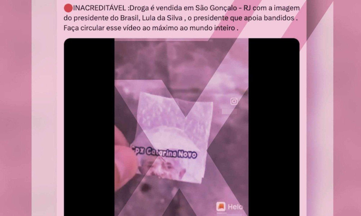 Circula nas redes sociais um vídeo no qual um homem segura um pequeno pacote de plástico com material análogo a droga embalado com a foto do presidente Luiz Inácio Lula da Silva (PT) e o escrito “Cpx Catarina Novo”.