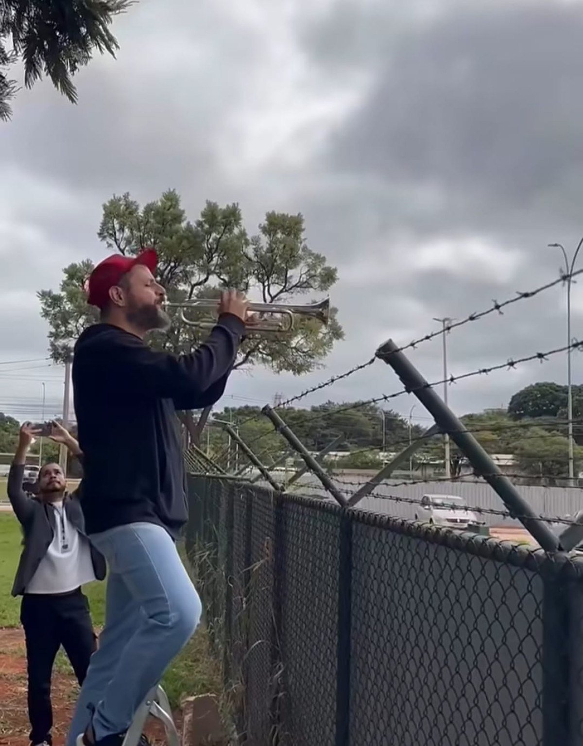 O trompetista levou uma escada , que foi posicionada rente ao muro que cerca o prédio onde está Bolsonaro.