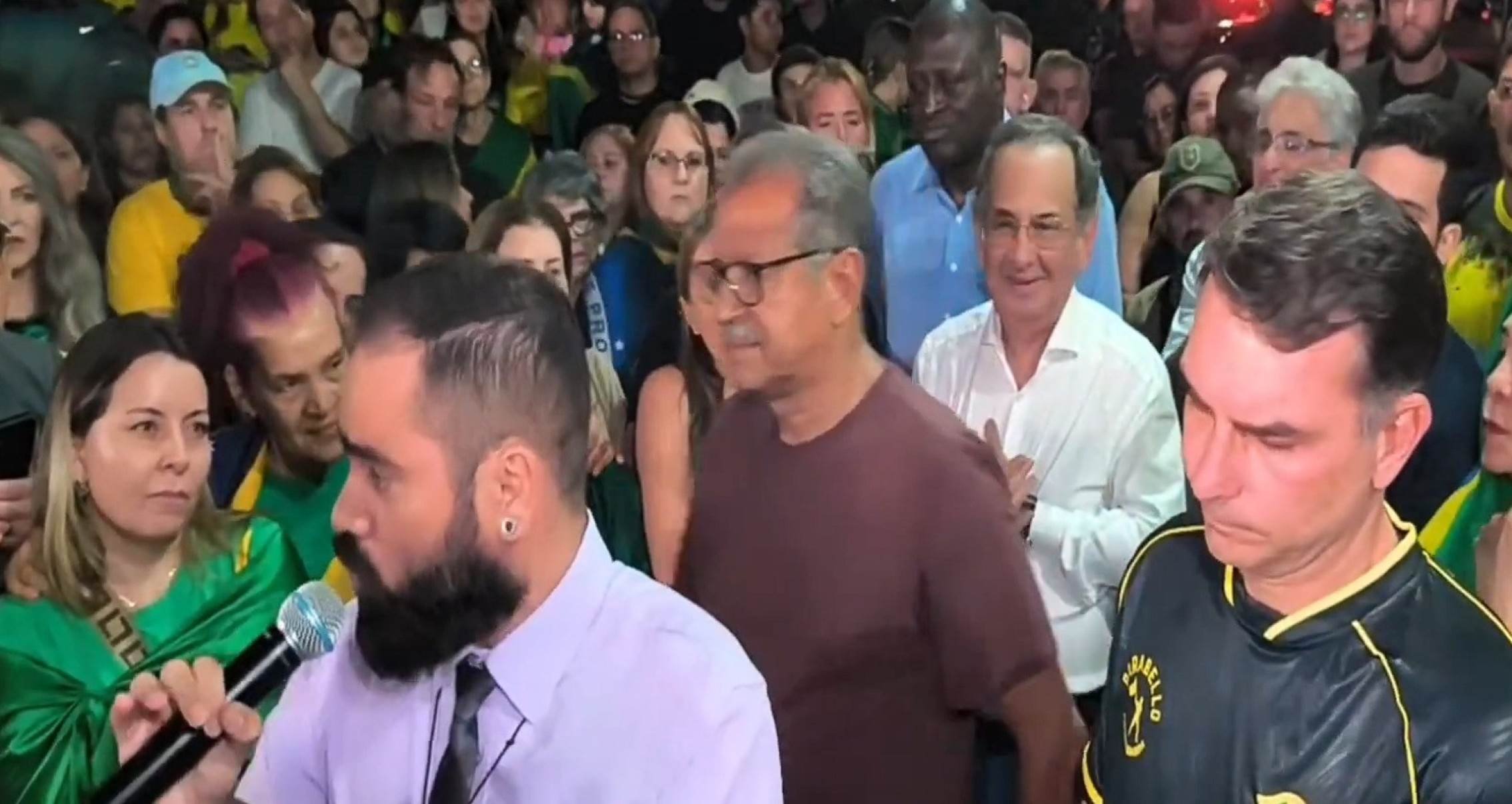 Flávio chegou ao local com seu irmão Carlos Bolsonaro (PL), vereador no Rio de Janeiro, e de outros políticos do campo bolsonaristas. Eles estavam acompanhados por políticos como o líder da oposição no Senado, Rogério Marinho (PL-RN), e os deputados federais Helio Lopes (PL-RJ) e Bia Kicis (PL-DF).
