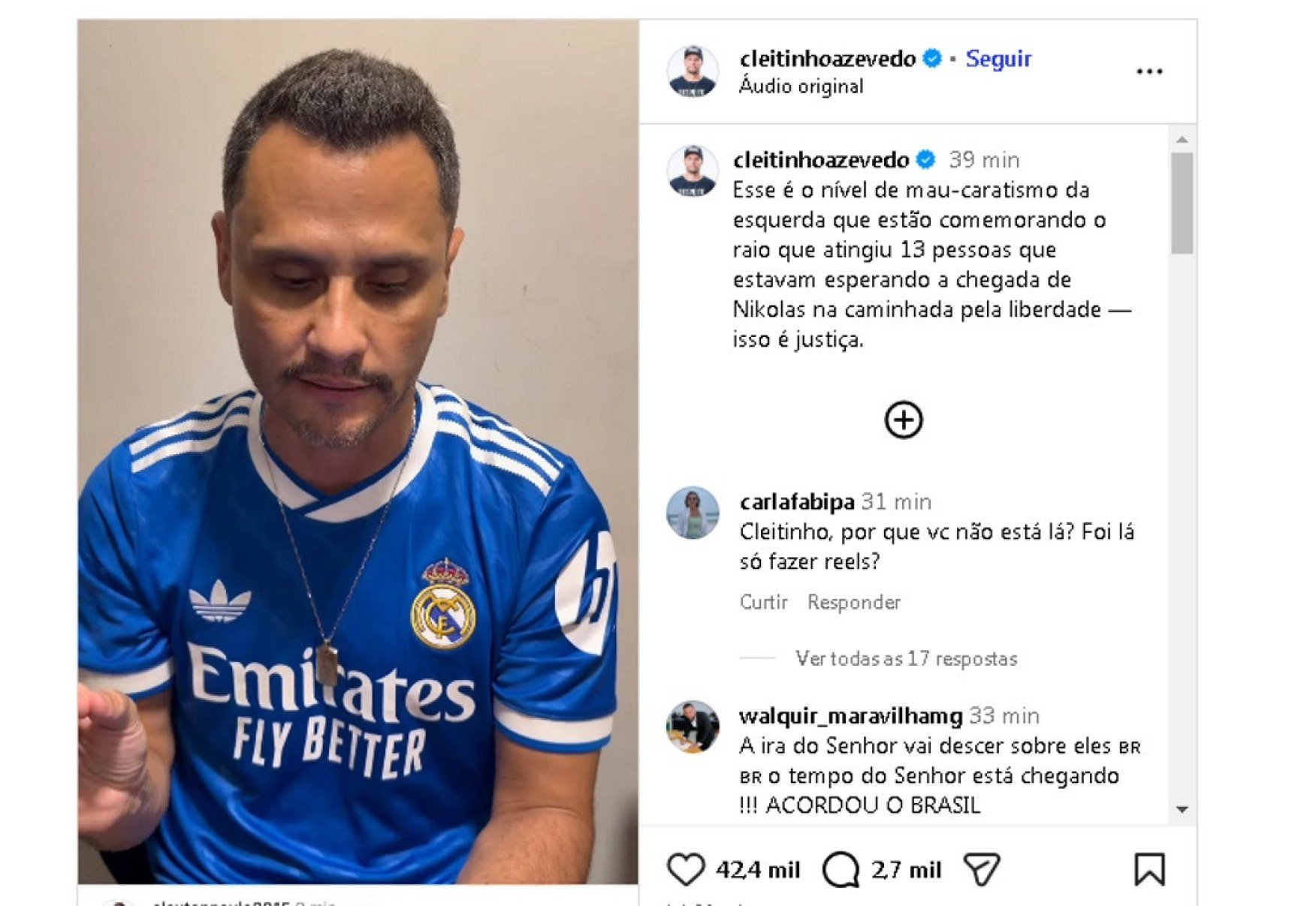 "Esse é o nível de mau caratismo da esquerda, comemorando o raio que atingiu pessoas que estavam esperando a chegada de Nikolas na caminhada pela liberdade — isso é justiça", escreve Cleitinho na legenda.