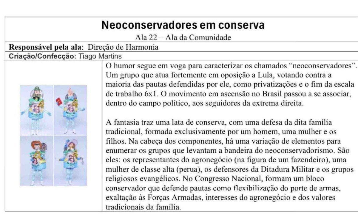 Desta vez, o governador de Minas Gerais chama a atenção para uma ala batizada de “Neoconservadores em conserva”, que vai criticar grupos que atuariam em oposição a Lula, contendo: representantes do agronegócio, uma “perua” de classe alta, defensores da Ditadura Militar e evangélicos. Todos esses “setores” estariam representados por figuras caricatas dentro de latas de conserva. Essas informações sobre o desfile estariam em um suposto livro Abre-Alas, que traz todas as informações repassadas para os jurados.