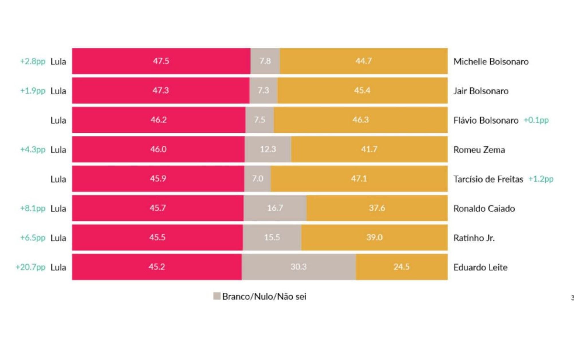 - Lula (PT) 47,5% x Michelle Bolsonaro (PL) 44,7%