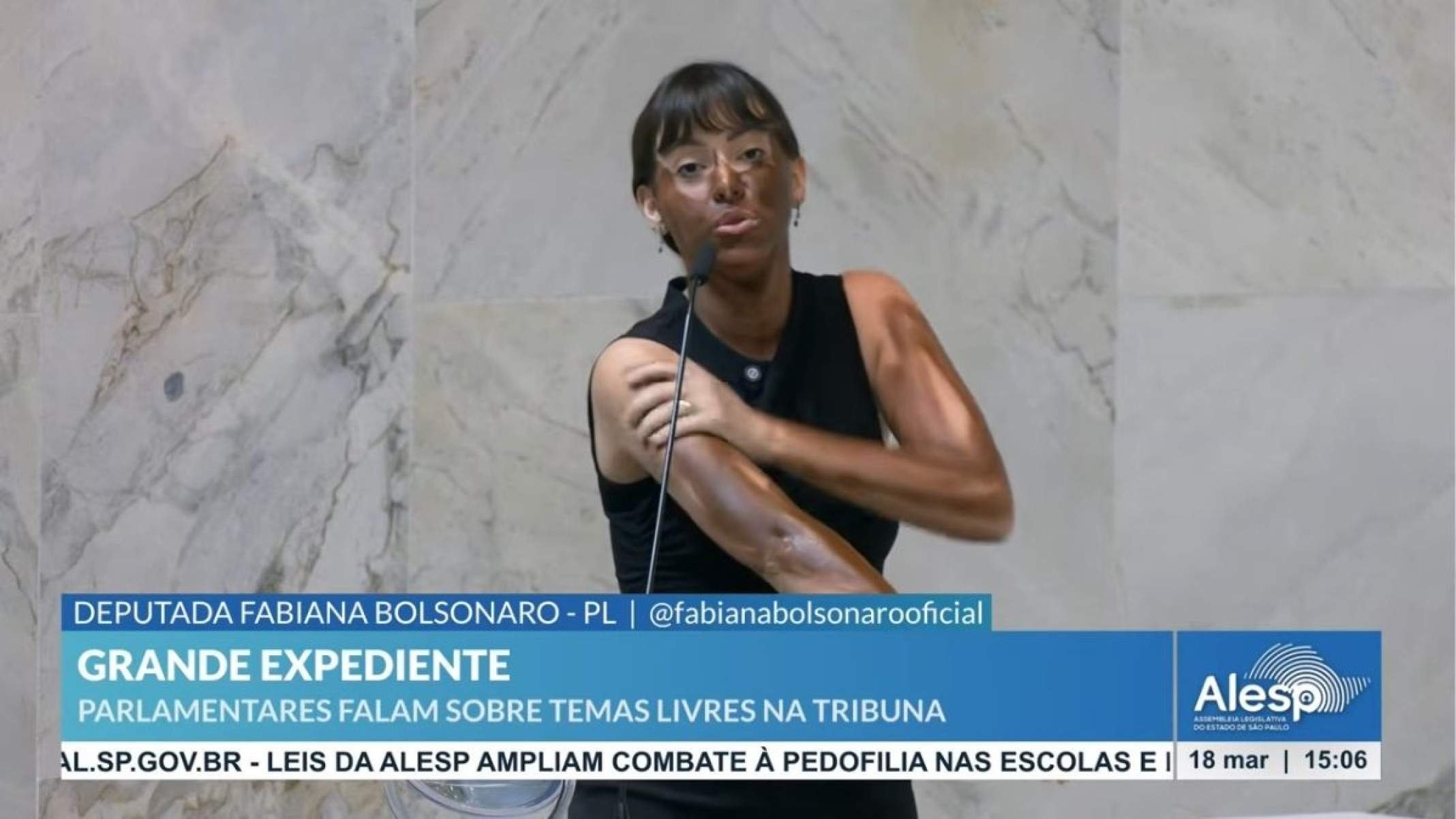 A deputada estadual paulista Fabiana Bolsonaro (PL) se pintou de marrom nesta quarta-feira (18/3), no Plenário da Assembleia Legislativa do Estado de São Paulo (Alesp), em protesto transfóbico contra a deputada federal Erika Hilton (Psol-SP).