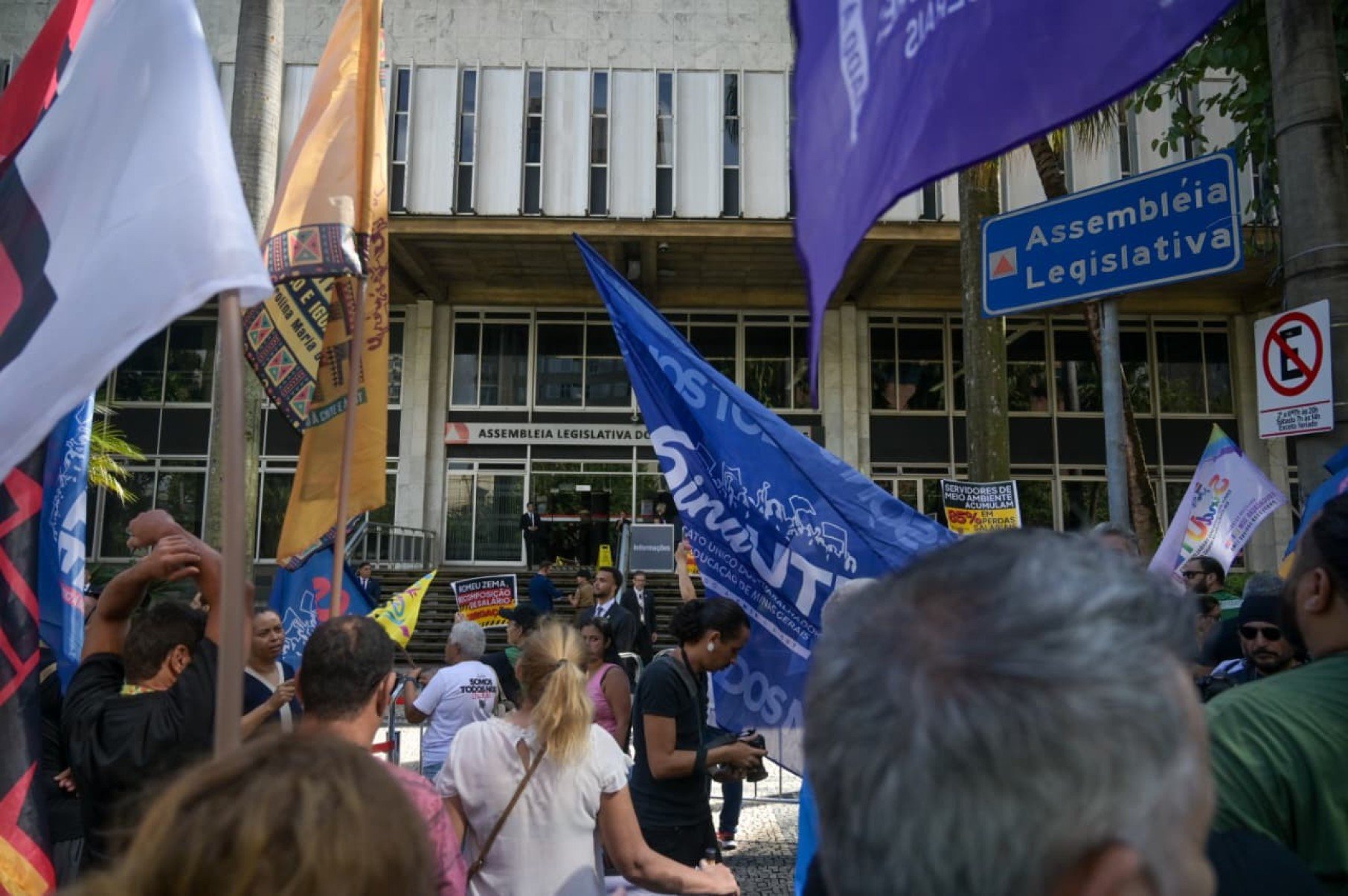 Servidores públicos do estado de Minas Gerais fazem manifestação em frente à Assembleia Legislativa de Minas Gerais (ALMG), em dia de posse do vice-governador Mateus Simões (PSD) na cadeira do Executivo do estado. O movimento acontece tendo em vista a renúncia de Romeu Zema (Novo), que concorre ao Planalto.