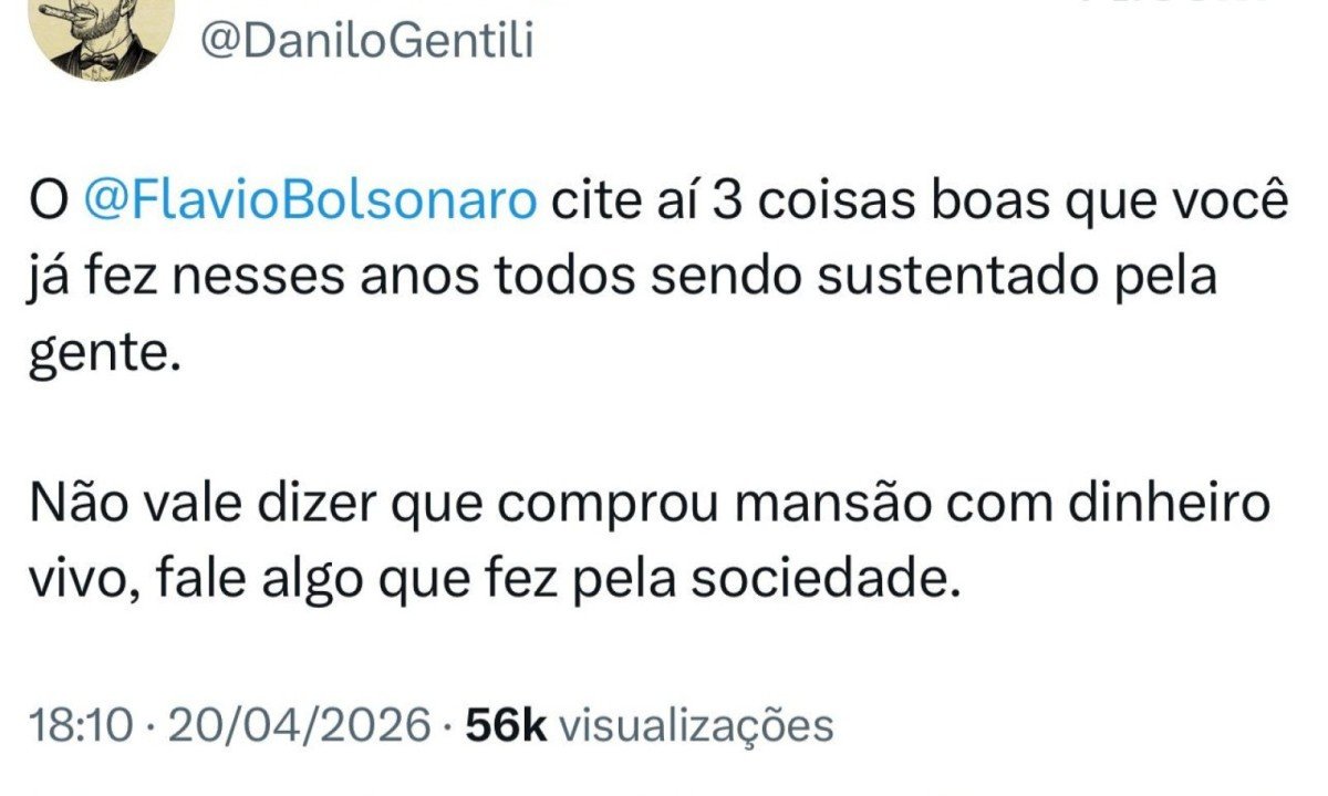 O apresentador e humorista Danilo Gentili publicou uma provocação ao senador (PL-RJ) e pré-candidato à Presidência da República Flávio Bolsonaro, no X, antigo Twitter, nesta segunda-feira (20/4). Mencionando o parlamentar no post, Gentili o desafiou: “Cite aí 3 coisas boas que você já fez nesses anos todos sendo sustentado pela gente”.