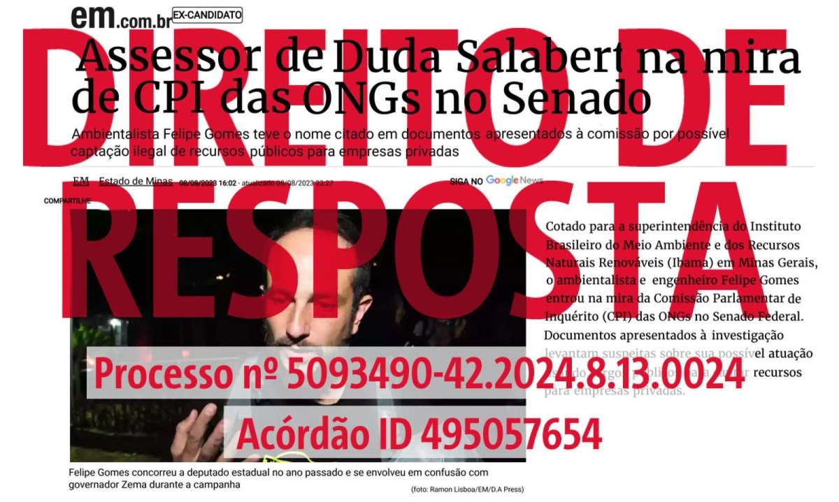 A Justiça Mineira reconheceu que o Jornal Estado de Minas publicou uma matéria falsa contra mim, Felipe Gomes. O jornal foi condenado a pagar R$ 12 mil por danos morais, remover a matéria do ar e publicar este direito de resposta.