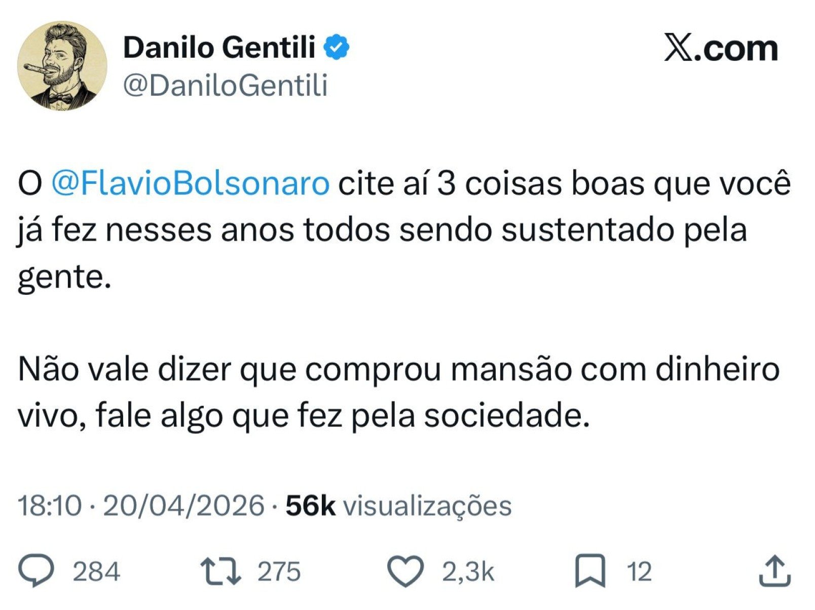 A provocação foi além. No mesmo post, o apresentador do "The Noite com Danilo Gentili" escreveu: “Não vale dizer que comprou mansão com dinheiro vivo, fale algo que fez pela sociedade”. O humorista fez referência à compra que o senador fez de uma mansão próxima ao Lago Paranoá, em Brasília, por R$ 5,97 milhões, em 2021.