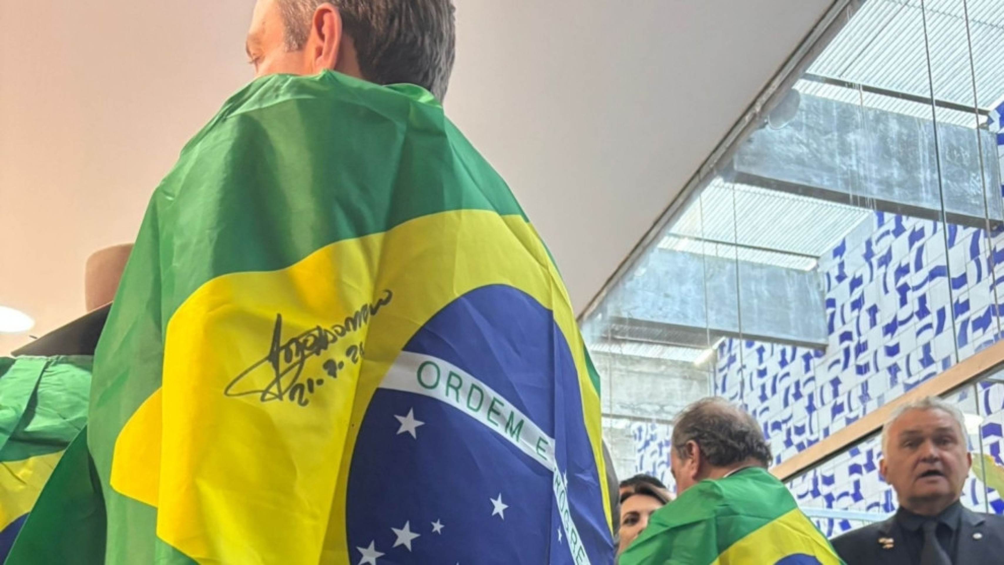 Os deputados apareceram para uma coletiva de imprensa na Casa com as bandeiras amarradas nas costas e afirmaram ter sido um gesto de Bolsonaro para “gerações futuras”.