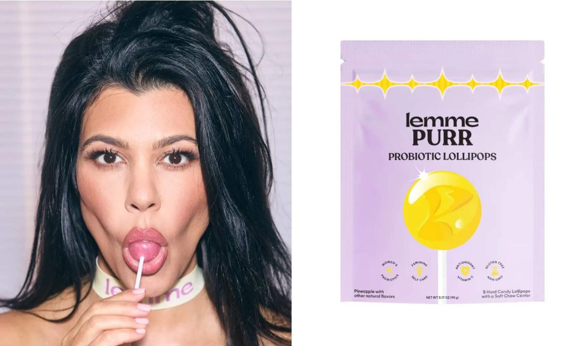 Empresária e membro do clã Kardashian-Jenner, Kourtney Kardashian anunciou uma novidade na sua marca de suplementos, a Lemme Purr. Trata-se de um pirulito probiótico com sabor de abacaxi e promessa de benefícios para a saúde vaginal.