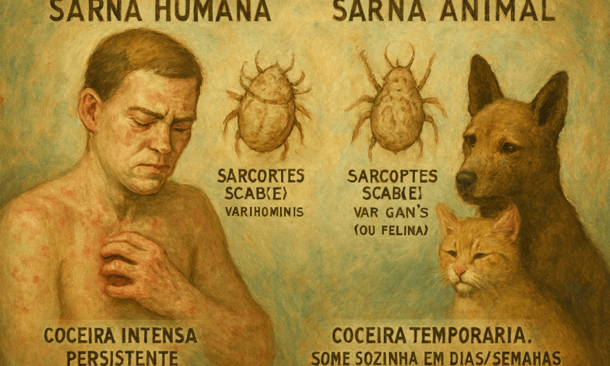 Embora haja semelhanças nos sintomas, o ácaro da sarna em humanos é específico para nossa espécie — animais causam apenas irritação temporária, sem reprodução o