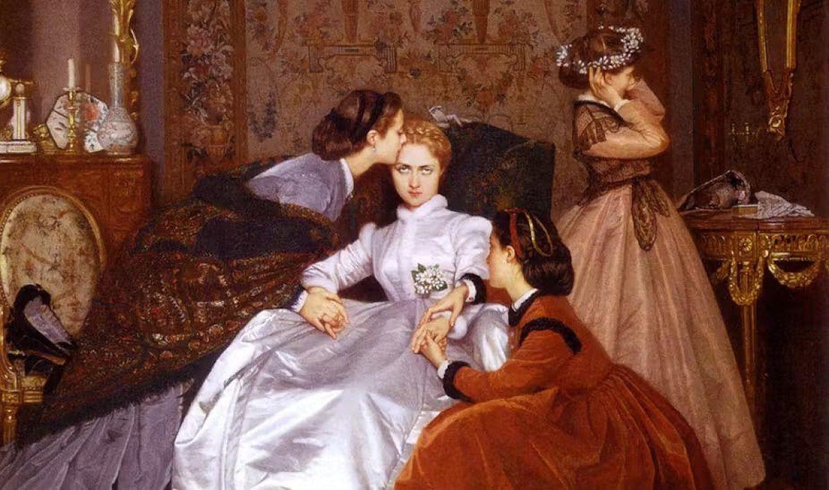 De onde veio essa pintura incomum? A Noiva Hesitante (também conhecida como A Noiva Relutante) foi pintada em 1866 pelo artista francês Auguste Toulmouche (1829-1890).