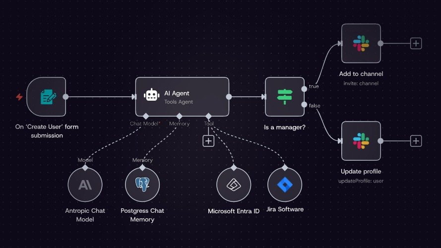 O fluxo de trabalho começaria com um nó que "ouve" o envio de novos formulários. Ao receber uma nova entrada, ele acionaria o próximo nó, que pegaria as informações de nome e e-mail e as adicionaria automaticamente a uma planilha no Google Sheets. Em seguida, um terceiro nó enviaria uma mensagem instantânea para um canal específico no Slack, avisando a equipe sobre o novo lead.